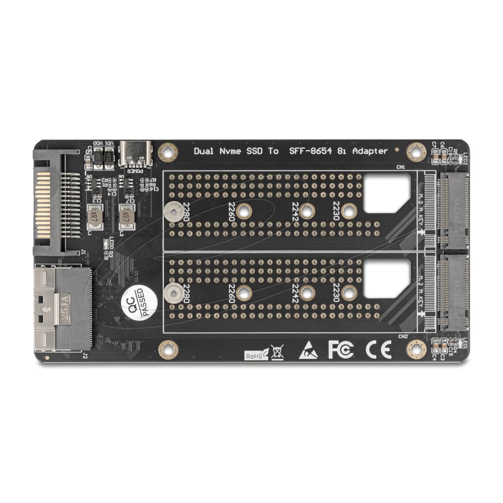 | Input connectors | 1x Slim SAS SFF-8654 8i female for data, 1x USB Type-C™ female (power supply) or 1x SATA 15 pin power connector for power |