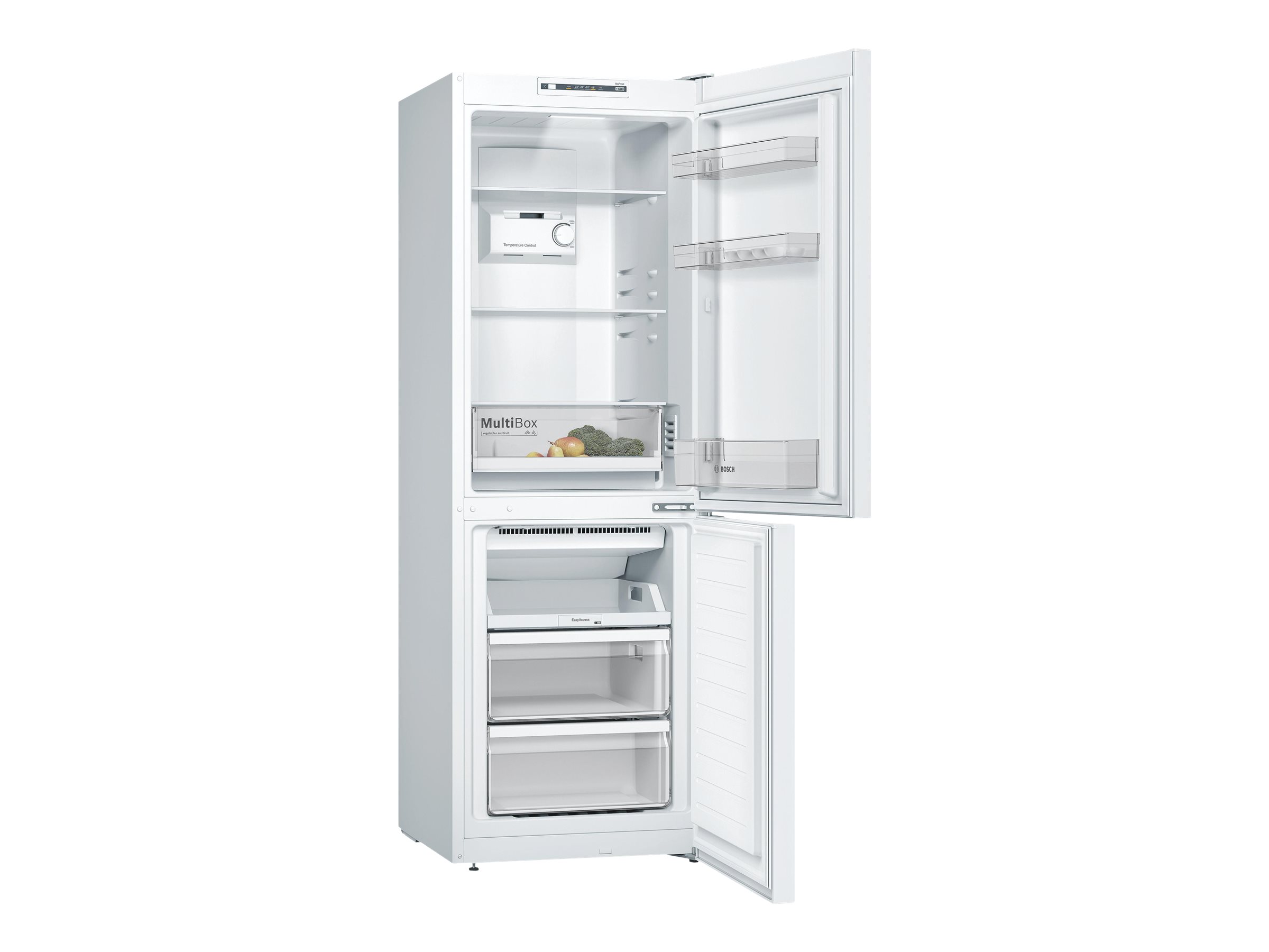 Køle-/fryseskab med NoFrost teknologi: du slipper for tidskrævende manuel afrimning. MultiBox-skuffen er perfekt til at beskytte og opbevare grønt og frugt, så de holder sig friske i længere tid.