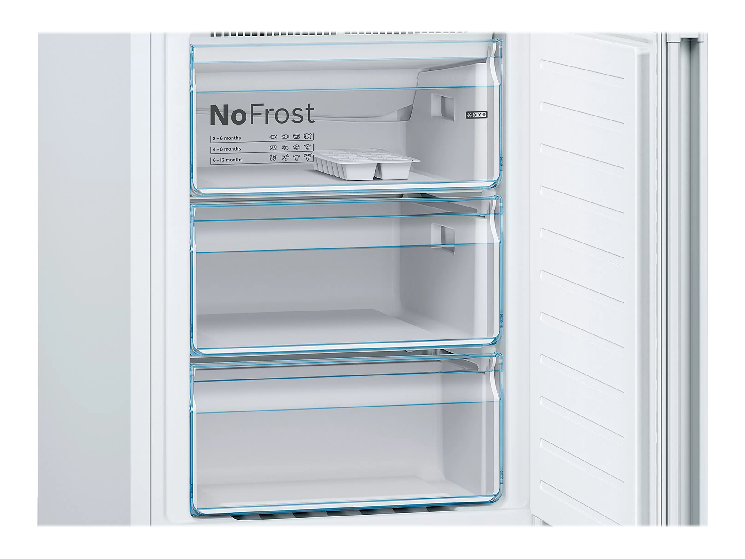 Køle-/fryseskab med NoFrost og VitaFresh. Du slipper for at afrime fryseren og med den praktiske VitaFresh skuffe holdes frugt og grønt frisk i længere tid.