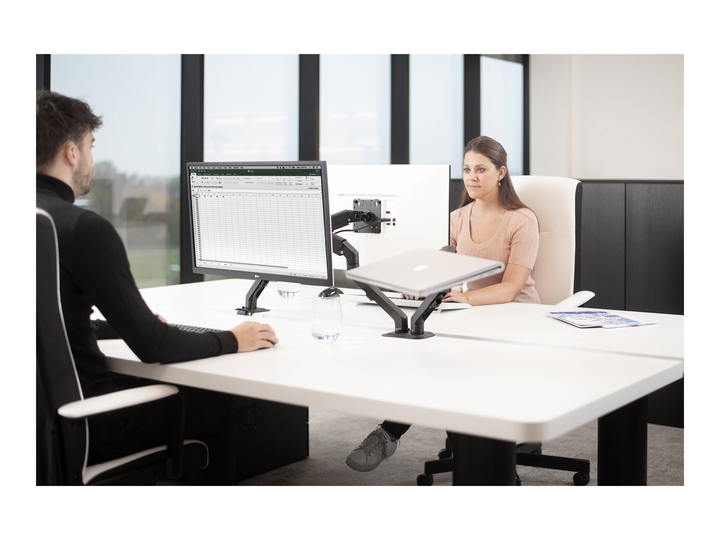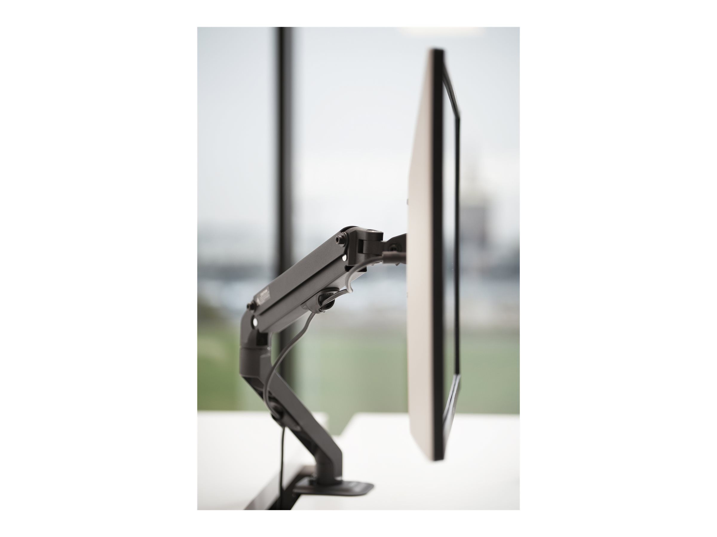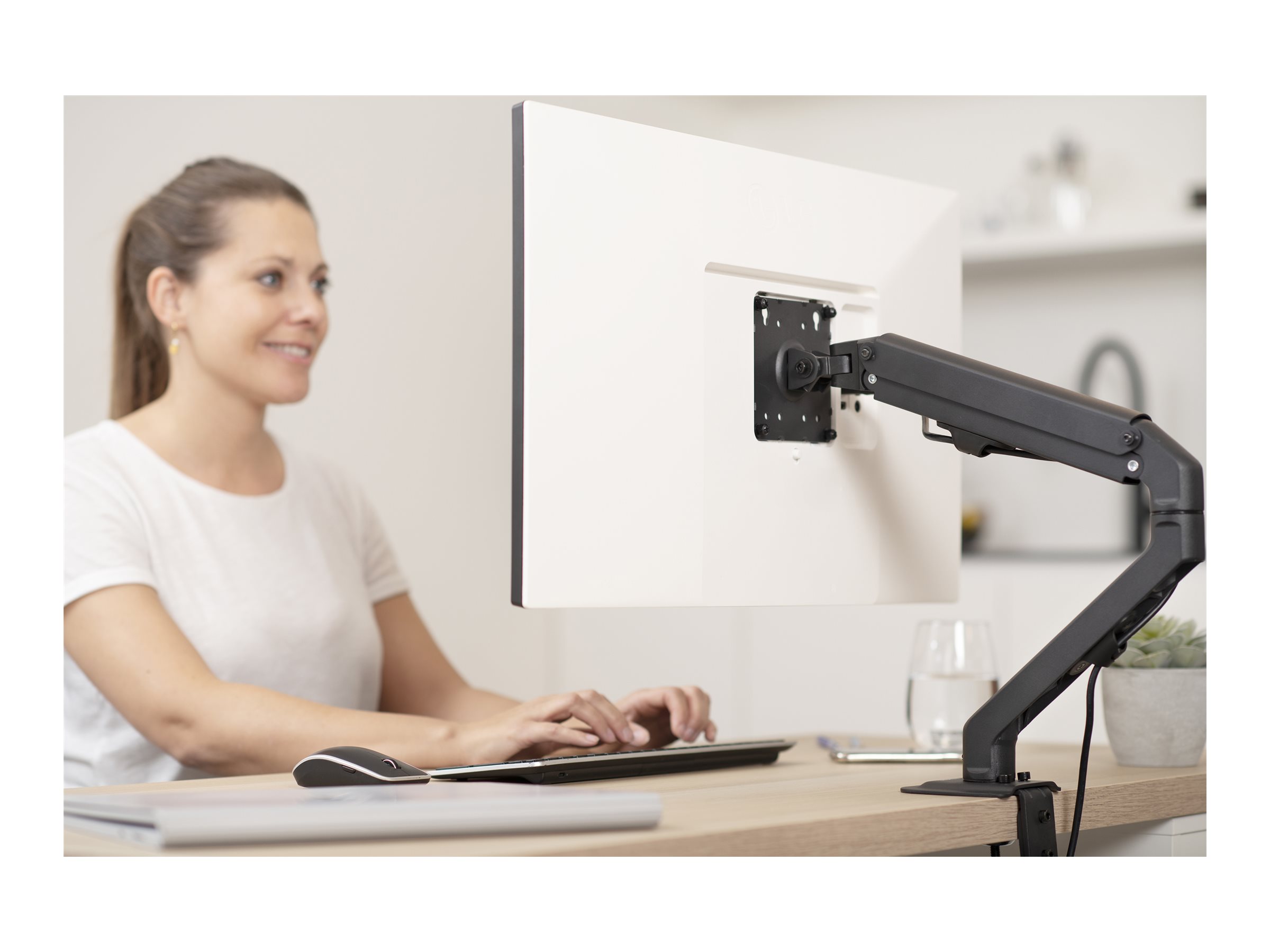 Visions VFM-DA/4-bordarm sikrer, at ethvert arbejdsområde kan have både ryddelige, æstetiske og ergonomiske arbejdsforhold uden at gå på kompromis. Den løfter skærmen væk fra skrivebordsfladen, eller den kan omstilles til en hylde til en bærbar computer eller tablet, så arbejdspladsen bliver mere ryddelig og giver mere plads til andet.