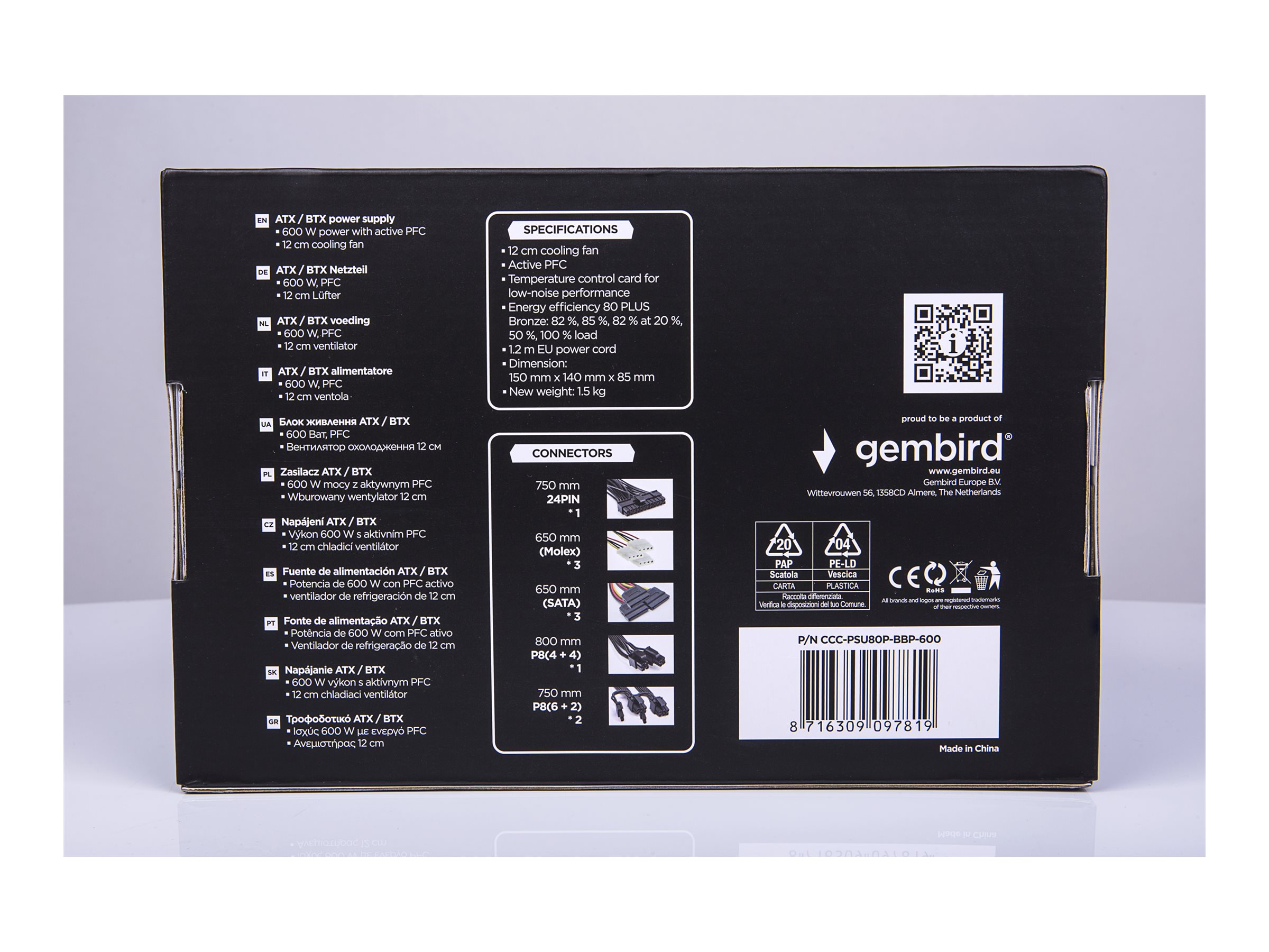 Gembird BlackBoxPower Series CCC-PSU80P-BBP-600 strømforsyning tilbyder ydeevne og pålidelig strømforsyning til computersystemer. Med en effekt på 600 watt understøtter den en række komponenter med spændinger på +3,3 V, +5 V og +12 V. Den er designet til at overholde ATX- og BTX-specifikationerne og sikrer kompatibilitet på tværs af forskellige konfigurationer. Den aktive effektfaktorkorrektion og højeffektivitetsværdier, der opnår op til 85 % under forskellige belastningsforhold, bidrager til energibesparelser og lavere elregninger.