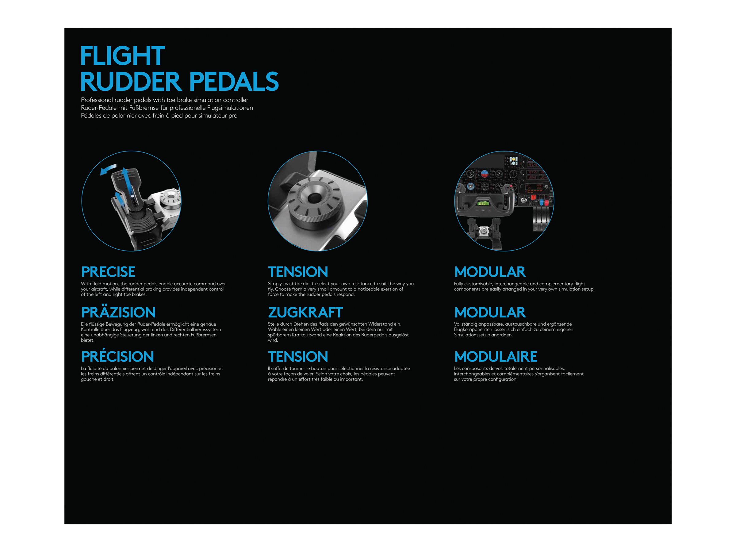 Rorpedalernes flydende bevægelse gør det muligt at have fuldstændig nøjagtig styring af flyet, mens den differentierede bremsefunktion giver uafhængigt styring med den venstre og højre tåbremse. Fodstøtten kan justeres så den passer til en lang række størrelser, og er lavet af materiale der ikke glider, så pedalerne bliver stående fast på gulvet under den virtuelle flyvning