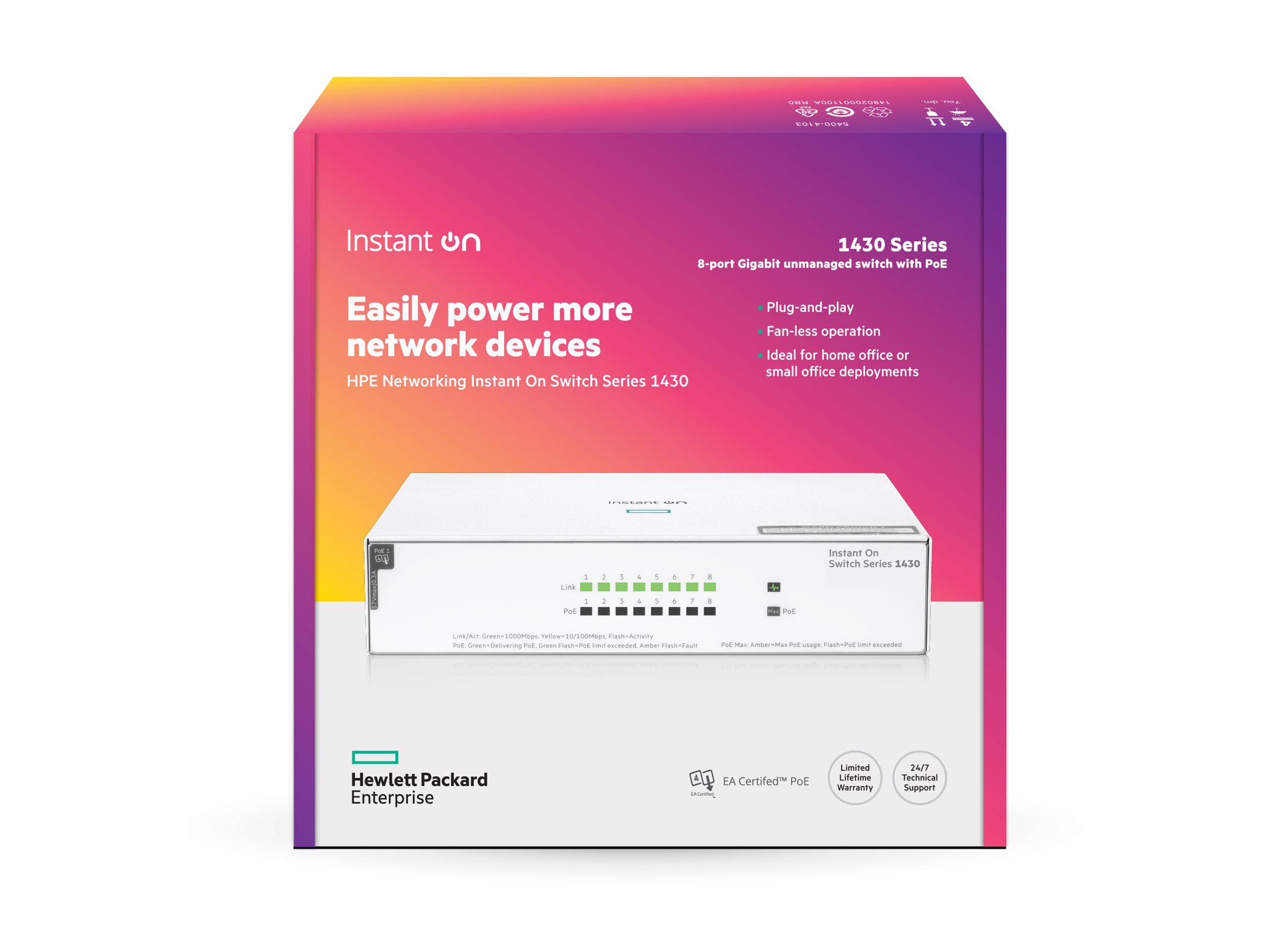 | Produktbeskrivelse | HPE Networking Instant On 1430 8G Class4 PoE 64W Switch - switch - 8 porte - ikke administreret - monterbar på stativ |