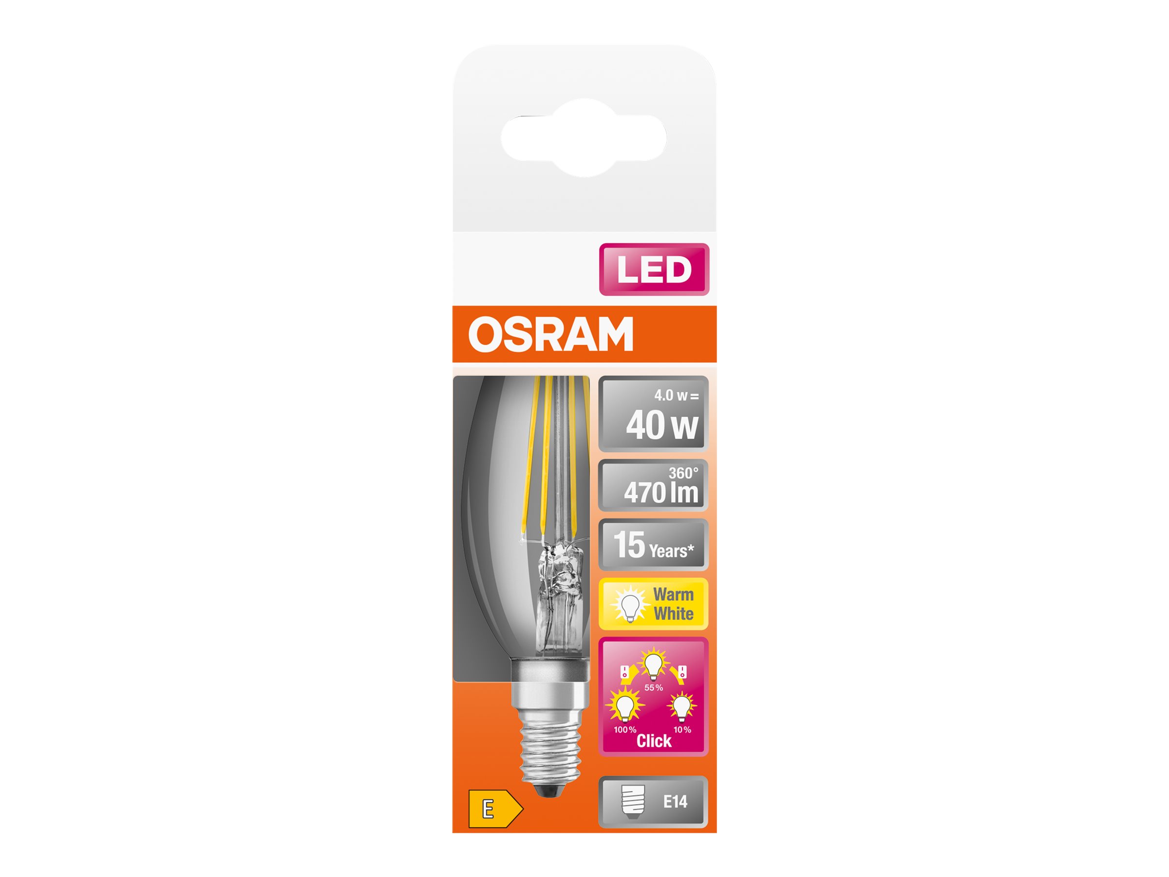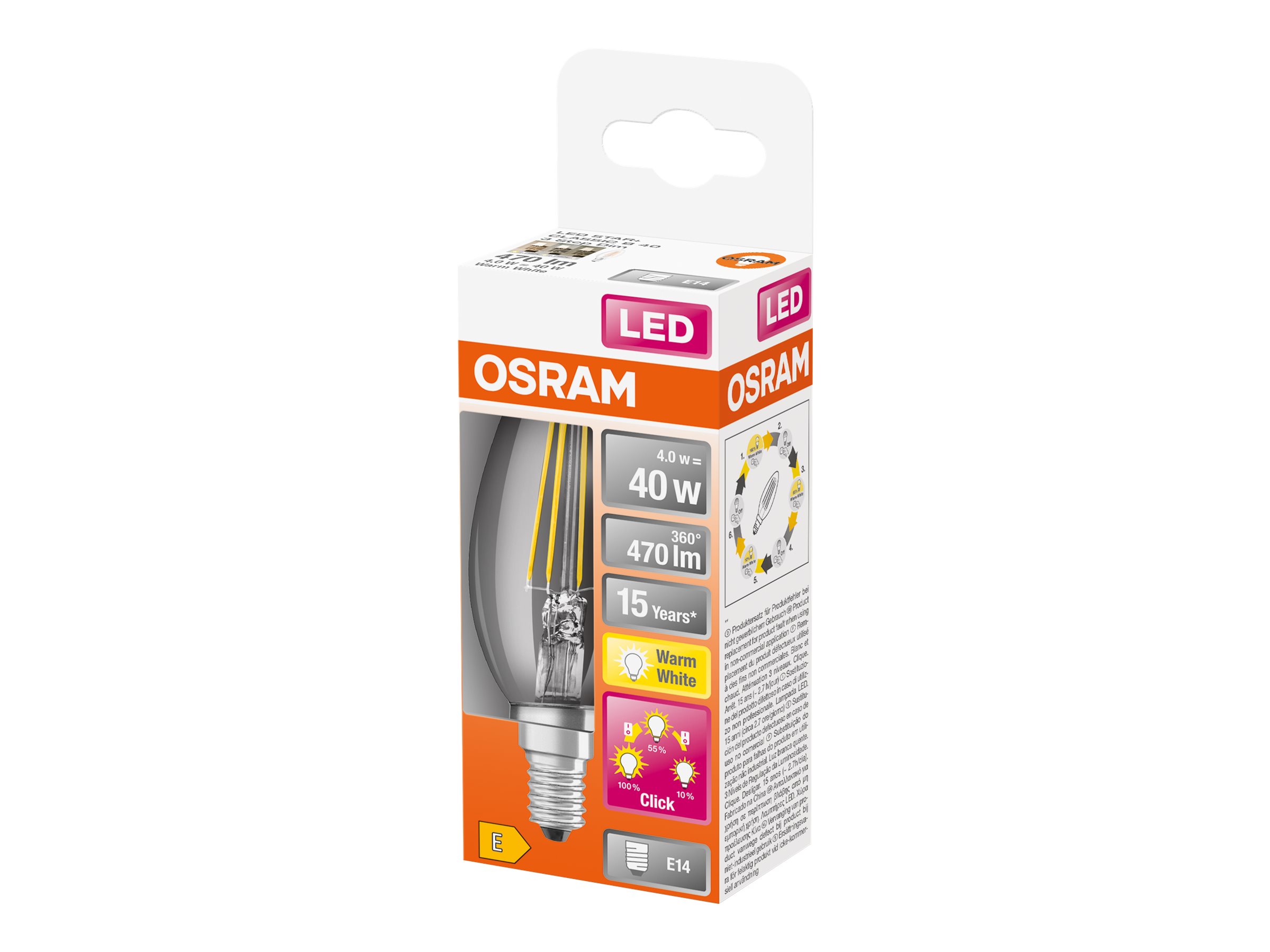 | Produktbeskrivelse | OSRAM LED STAR+ - LED-filament-lyspære - form: B35 - klar finish - E14 - 4 W - varmt hvidt lys - 2700 K |