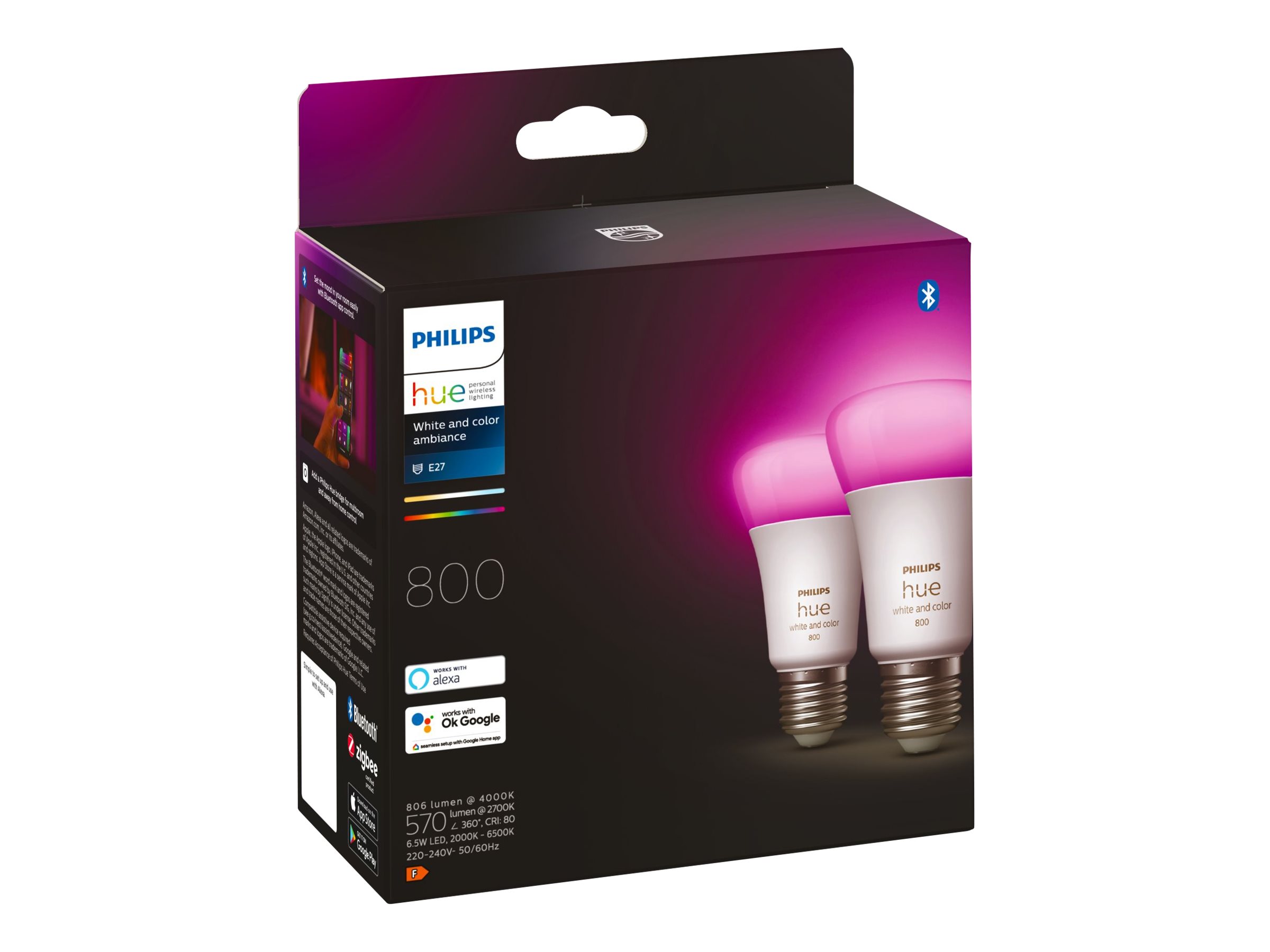 Disse to intelligente E27 LED pærer passer til de fleste lamper og giver dig intelligent belysning hvor som helst i dit hjem. Sæt øjeblikkelig stemningen med millioner af nuancer af hvidt og farvet lys.