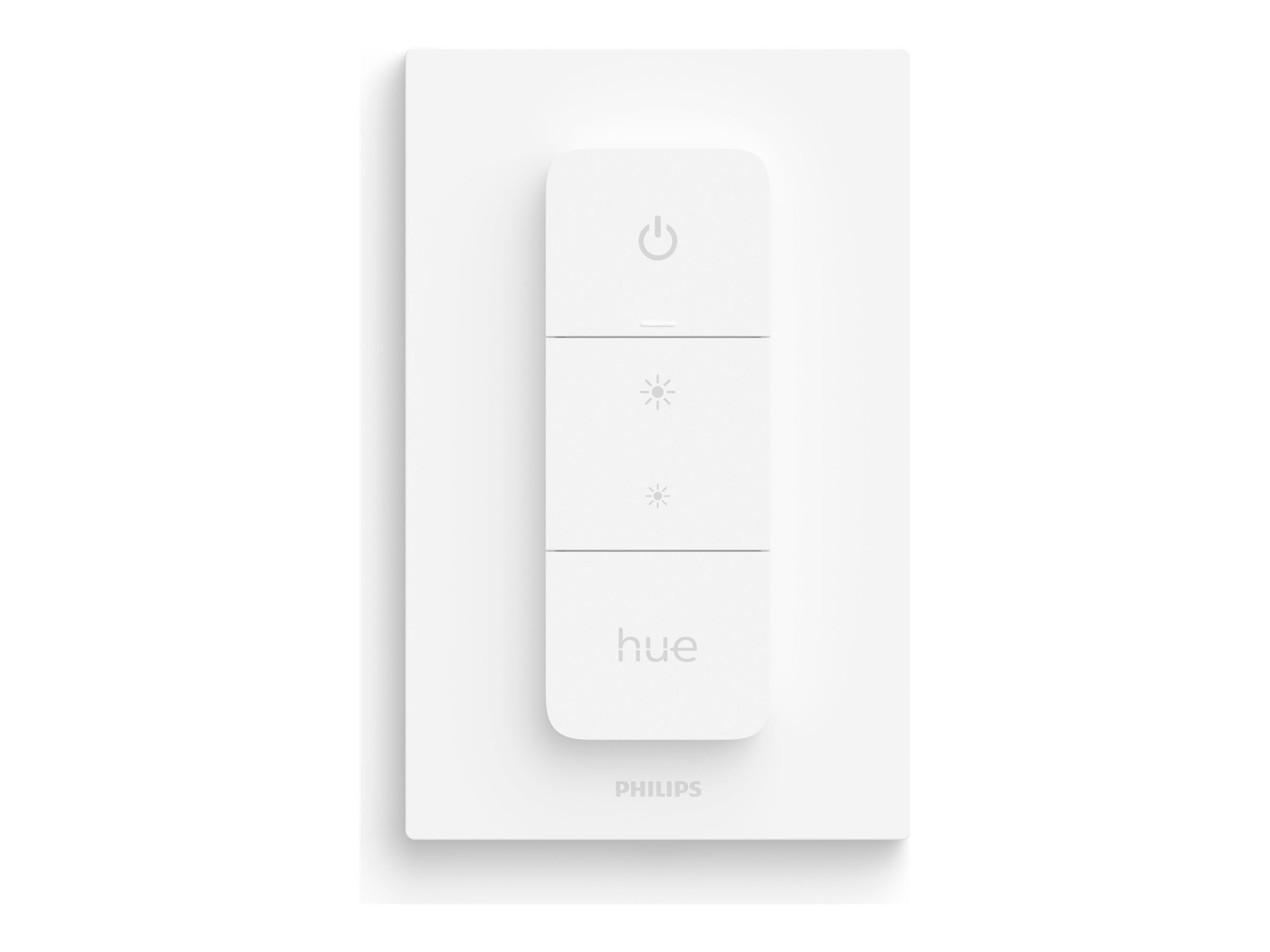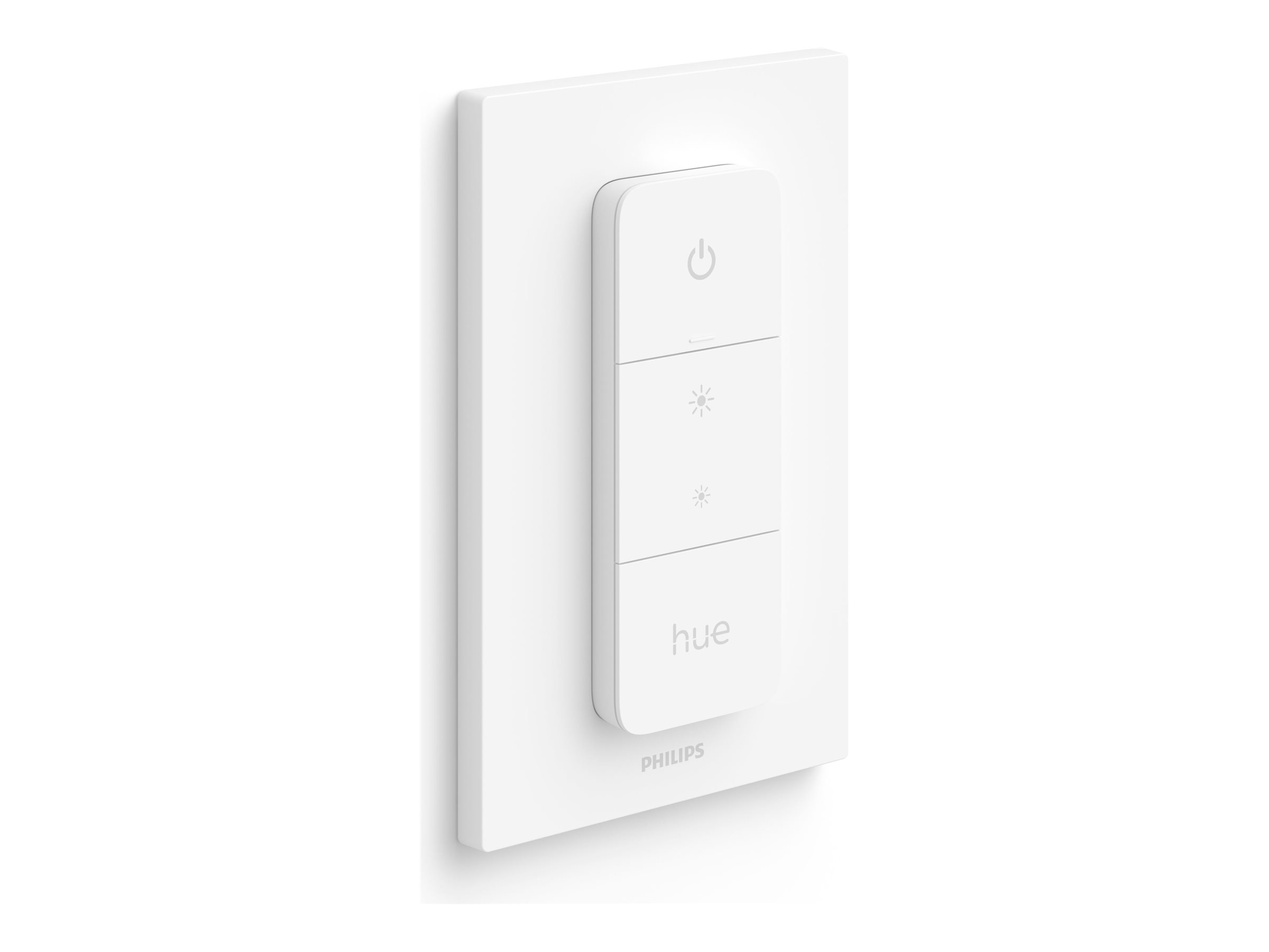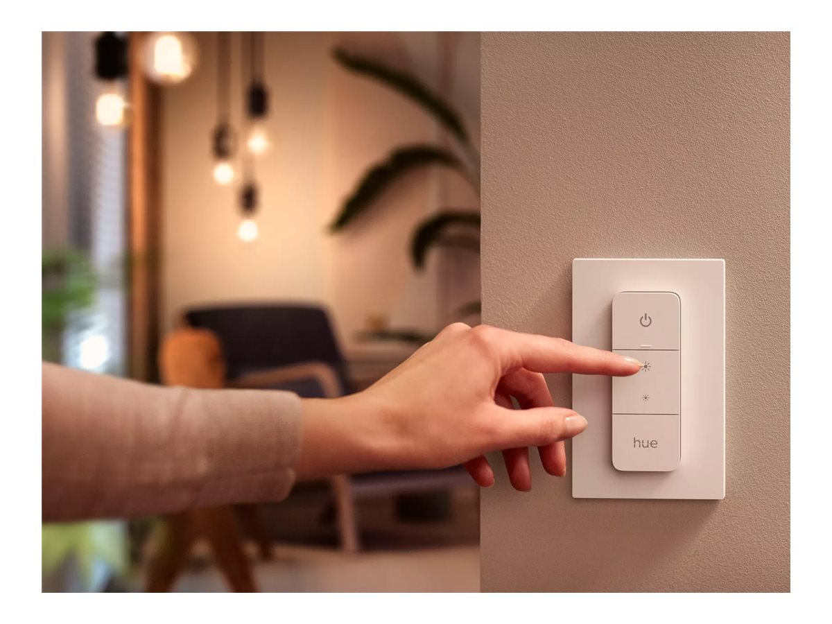 Få øjeblikkelig kontrol over din intelligente belysning fra Philips Hue med en Hue dimmer switch. Med ét tryk på en knap kan du styre lyset i hele dit hus. Dæmp eller oplys rummene, tænd og sluk for lyset eller skift mellem belysningsscener.