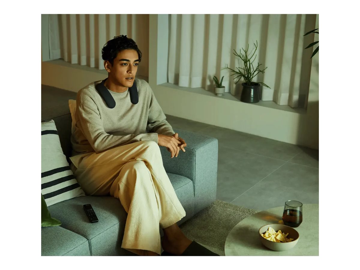 Sony BRAVIA Theater U HT-AN7 er specielt designet til hjemmebiografentusiaster, der sætter pris på komfort. Dens design, der sidder rundt om halsen, giver mulighed for længere lyttesessioner uden det ubehag, der er forbundet med traditionelle hovedtelefoner eller ørepropper.