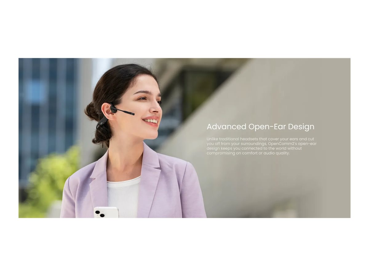 Oplev Shokz OpenComm2, et headset designet til at forbedre din kommunikationsoplevelse. Med sin benledende teknologi og PremiumPitch 2.0 kan du nyde stereolyd i høj kvalitet uden at blokere dine ører, hvilket giver mulighed for situationsbevidsthed i ethvert miljø. OpenComm2 har Bluetooth 5.1, der giver pålidelige og klare forbindelser på op til 30 meters afstand, så du aldrig er bundet til din enhed.