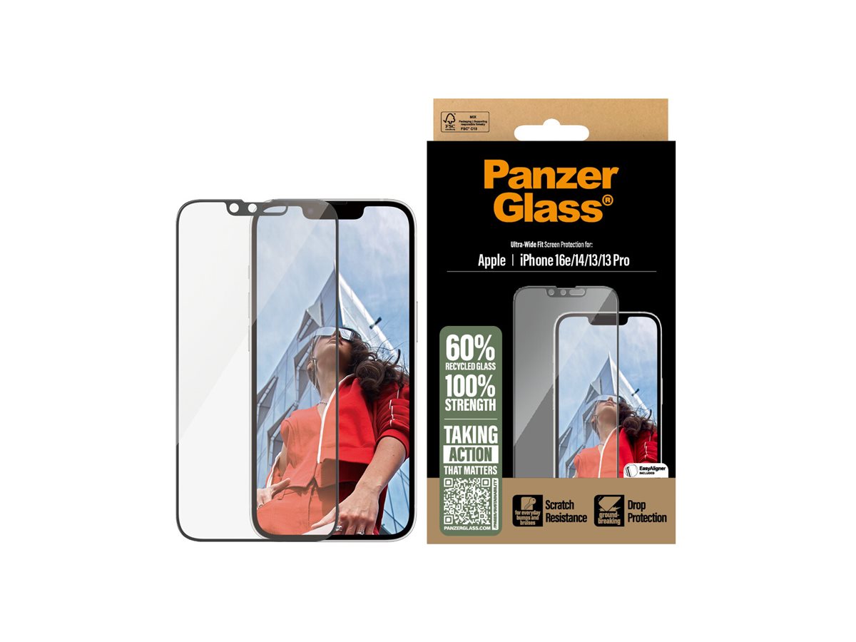 Mere genanvendelse. Bedre beskyttelse. Længere telefonlevetid. Med den her skærmbeskytter fra PanzerGlass får du det hele. Skærmbeskytteren er lavet af 60 % genanvendt materiale, er 3 x mere ridsefast end tidligere modeller og holder både ridser, revner, slag og stød på sikker afstand af din skærm – vel at mærke uden at det går ud over telefonens funktionalitet og design. Glasset har endda en smudsafvisende belægning, der reducerer fedtfingre og snavs på skærmen. Skærmbeskytteren kan forlænge levetiden på din telefon, så du måske en dag kan give den videre til en anden, som vil elske den lige så højt som dig. Det er ren telefonkærlighed. For jo længere vi kan holde vores enheder i live, jo længere kan vi vente med at producere nye enheder, som belaster miljøet. Og nu vi taler om miljøet, bruger den her skærmbeskyttelse 33 %* mindre papiremballage end tidligere modeller og leveres i en genanvendelig FSC -mærket æske. Sammen med skærmbeskytteren får du en såkaldt EasyAligner, der gør installationen så legende let, at de fleste kan gøre det i første forsøg. Og ellers følger du bare trin-for-trin-guiden eller scanner QR-koden til sådan-installerer-du-videoen. Når først skærmbeskytteren sidder på telefonen, er det slut med at frygte synet af din skærm med kurs mod asfalten. Det kommer muligvis aldrig til at ske, men hvis det gør, vil du fortryde, at du ikke klikkede "Tilføj til kurv".Skærmbeskytteren har størrelsen "Ultra-Wide Fit". Det betyder, at den dækker fronten af din telefon, samtidig med at den giver dig en krystalklar skærmoplevelse og efterlader lidt plads langs kanterne til et cover. Vil du give din telefon 360-graders beskyttelse, kan du kombinere skærmbeskyttelsen med et PanzerGlass cover og en PanzerGlass PicturePerfect eller Hoops kameralinsebeskytter.*Beregnet af tredjepartslaboratorium ved at sammenligne vægten af den nye papiremballage introduceret i 2023 med vægten af den tidligere papiremballage introduceret i 2022 (CPRTC, rapportnummer ZSA20231301-0016).