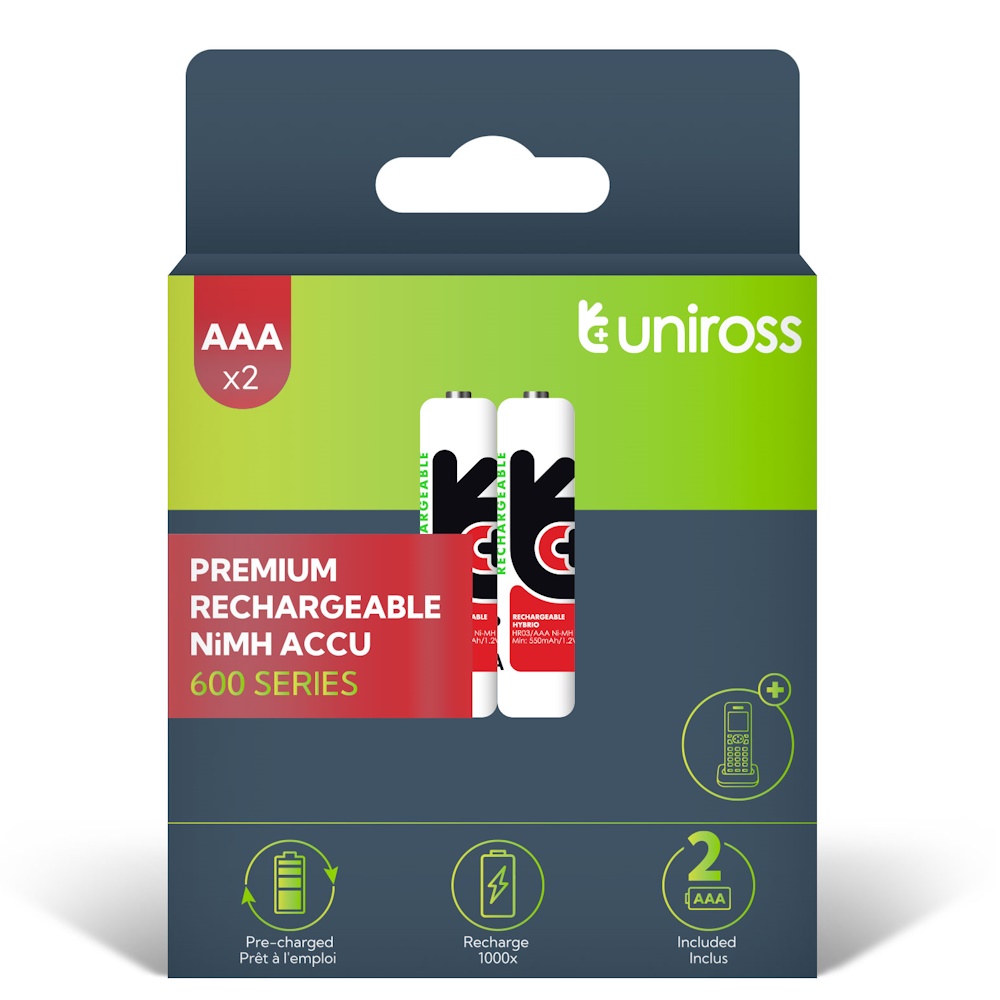 Uniross Ni-MH AAA / HR3 Genopladelige Batterier 600mAh, 2 stk.