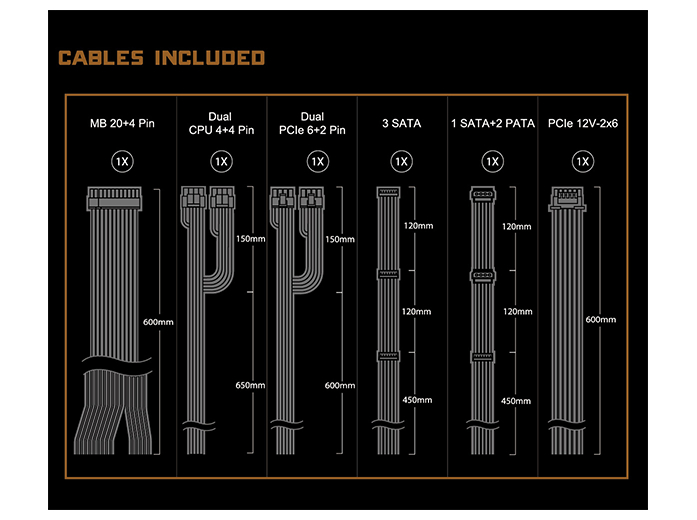 | Output-stikforbindelser | 1 x strøm 24 pin ATX med aftagelig 4 pin sektion | 1 x Dual strøm 8 pin +12 V med aftagelig 4 pin sektion | 1 x 8 pin PCI Express-strøm med aftagelig 2 pin sektion | 1 x Dual 8 pin PCI Express-strøm med aftagelig 2 pin sektion | 3 x 3 15 pin Serial ATA strøm | 1 x 15 pin Serial ATA strøm + 2 x PATA |