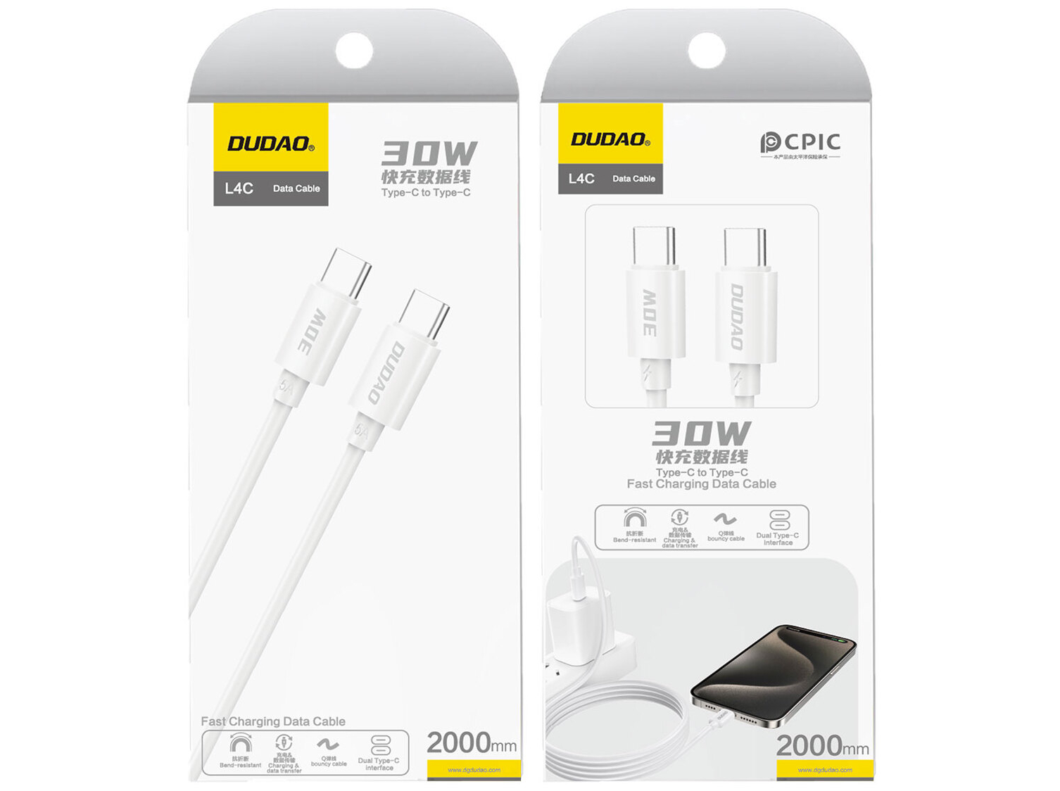 Dudao - USB-kabel - USB-C (han) til USB-C (han) - 2 meter - 30 Watt - hvid