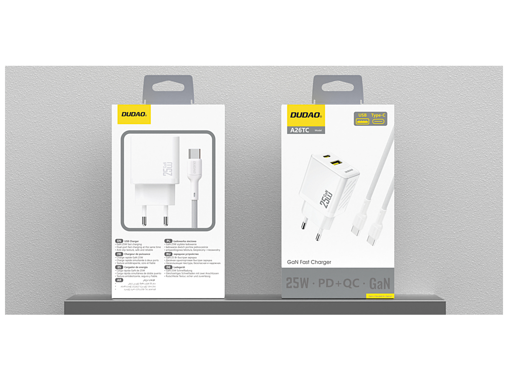 Dudao - Strømforsyningsadapter - GaN - 25 Watt - 1x USB-C, 1x USB-A - USB-C til USB-C Kabel - Europa - Hvid