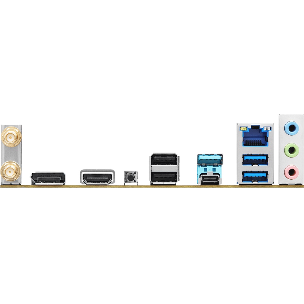 | Rear Panel I/O | 2x Antenna Ports, 1x HDMI Port, 1x DisplayPort 1.4, 1x USB 3.2 Gen1 Type-C Port, 3x USB 3.2 Gen1 Type-A Ports, 2x USB 2.0 Ports, 1x RJ-45 LAN Port, HD Audio Jacks: Line in / Front Speaker / Microphone |