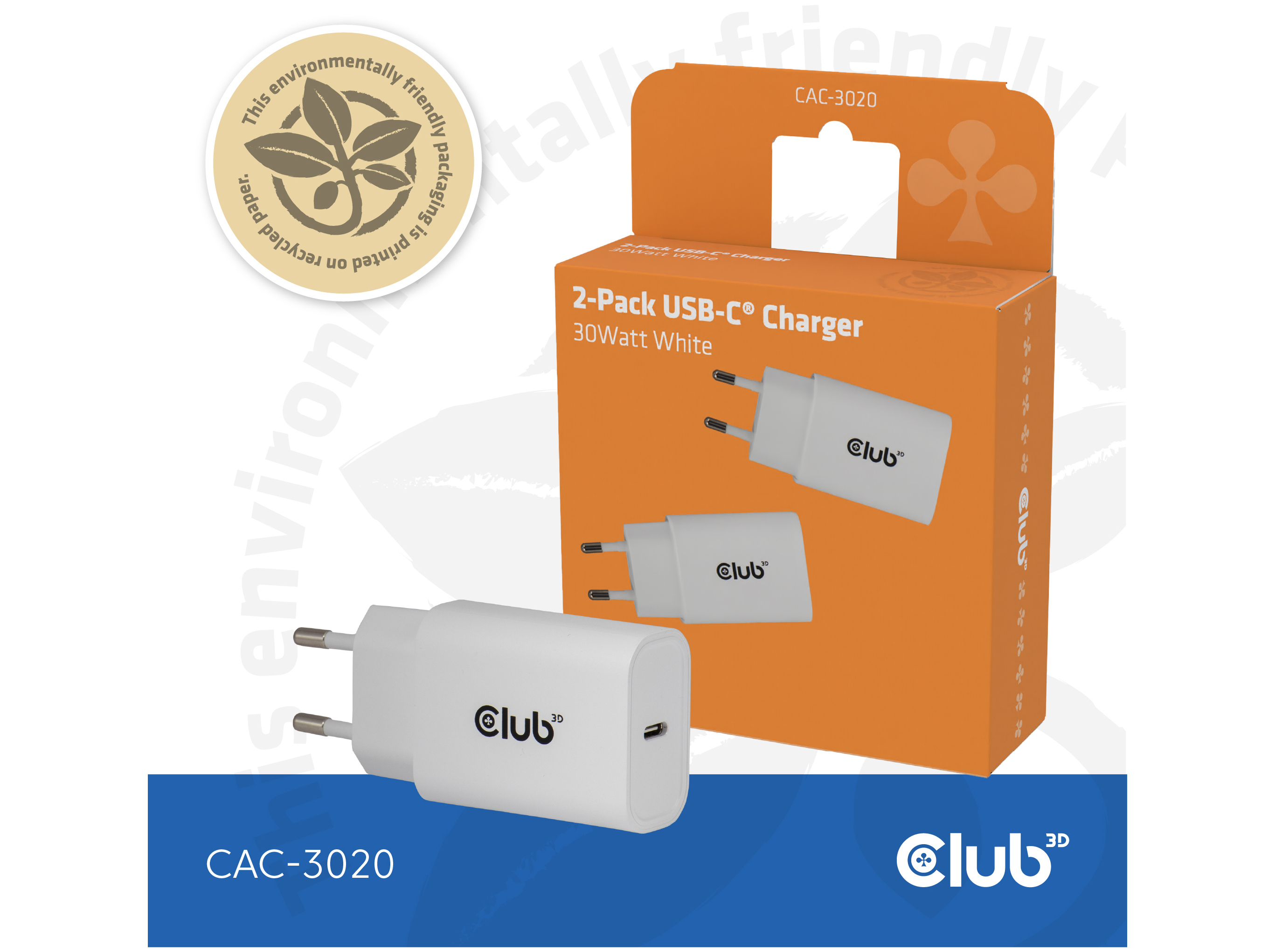 Club 3D CAC-3020 - Strømforsyningsadapter - USB Power Delivery (PD) - 30 Watt - 3 A - PD 3.0 - 1 output-stikforbindelser (1 x USB-C) - hvid - 2 stk.