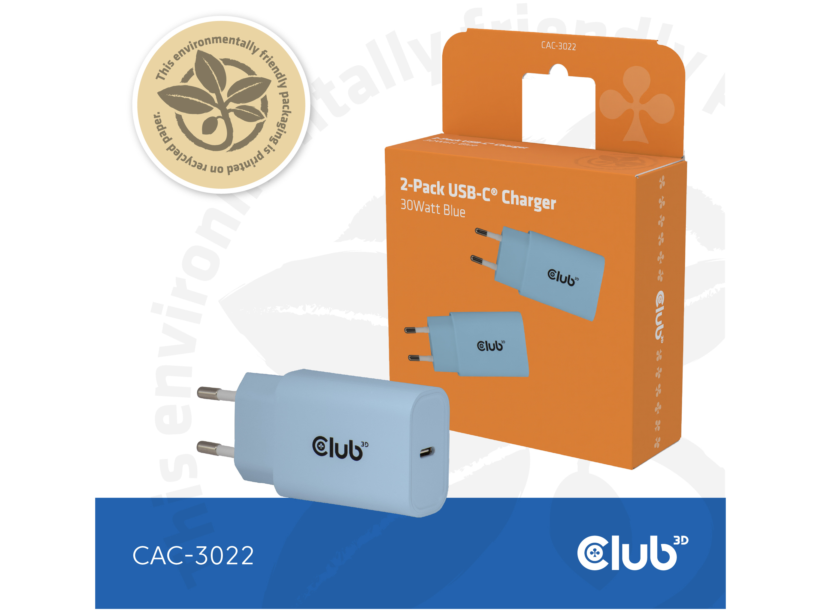 Club 3D CAC-3022 - Strømforsyningsadapter - USB Power Delivery (PD) - 30 Watt - 3 A - PD 3.0 - 1 output-stikforbindelser (1 x USB-C) - blå - 2 stk.