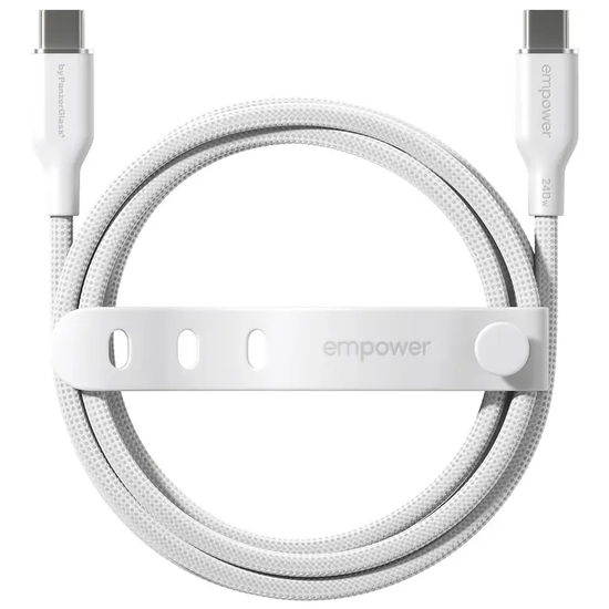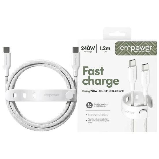 Hurtig opladning empower by PanzerGlass Racing USB-C til USB-C-kabel op til 240 W er skabt til dig, der vil have fart på opladningen og styr på kablerne. Brug det til din MacBook, iPhone, Samsung, AirPods – eller en hvilken som helst anden enhed med USB-C.Én ledning til alle dine enheder• Understøtter hurtig opladning op til 240 W• Længde 1,2 meter • Testet til at holde til op mod 30.000 bøjninger• Ultrablødt og filtre-frit design• Inkl. smart kabelstrop• Lavet af 100 % genanvendt plast (PCR)Kabel med fart på og lang holdbarhedMød empower by PanzerGlass Racing Cable Series – når pålidelighed møder fart! Det er nøje designet til at sikre lang levetid og maksimal holdbarhed og kan holde til hele 30.000 bøjninger.Mindre ventetid. Mere dig-tid.Det slidstærke, kraftige flettede ydre og det bløde, robuste silikoneindre gør både kablet stærkt til hverdagens ryk og træk og lækkert at røre ved. Og når du ikke bruger det? Så ruller du det nemt sammen med den medfølgende strop. Og hey – det er produceret af 100 % post-consumer genanvendt plast. What's not to like?Den hurtigere opladning betyder, at du bruger mindre tid på at vente og mere tid på det, du elsker.Hej, vi er empower by PanzerGlass Vi producerer ekstraordinære accessories, der giver folk mulighed for at holde kontakten til venner, familie, kollegaer og teknologi hver eneste dag.