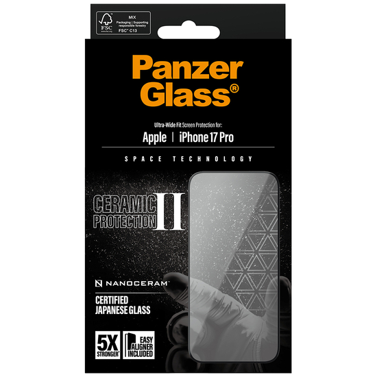 Med Ceramic Protection rækker PanzerGlass ud efter stjernerne og giver dig sin stærkeste skærmbeskytter til dato … ja, faktisk er Ceramic Protection hele 5 gange stærkere end vores stærkeste skærmbeskytter til dato! Det svarer til, at du kan lade en 320 g tung stålkugle falde fra 2,5 meter og ned på skærmbeskytteren, uden at den får så meget som en revne. Det er et tungtvejende argument, hvis du spørger os.Skærmbeskytteren er lavet af certificeret keramisk glas fra japanske Ohara. Keramisk glas er ikke blot et af verdens mest ridsefaste materialer, men indeholder også ikke-synlige krystaller, der forhindrer revner i at sprede sig. Det giver keramisk glas en styrke, som ikke kan opnås med konventionelt skærmbeskytterglas. Og som om det ikke var nok, sikrer Oharas nano-krystalliseringsteknik en hidtil uset klarhed i glasset, som endda er udstyret med en smudsafvisende belægning, der reducerer fedtfingre og snavs.Den medfølgende EasyAligner gør installationen så legende let, at de fleste kan klare den i første forsøg. Og ellers er det bare at følge trin-for-trin-guiden eller scanne QR-koden til sådan-installerer-du-videoen. Når først skærmbeskyttelsen sidder på telefonen, er det slut med at frygte synet af din skærm med kurs mod asfalten. Det kommer muligvis aldrig til at ske, men hvis det gør, vil du fortryde, at du ikke klikkede "Tilføj til kurv".Skærmbeskytteren har størrelsen "Ultra-Wide Fit". Det betyder, at den dækker fronten af din telefon, samtidig med at den giver dig en fuldendt skærmoplevelse og efterlader lidt plads langs kanterne til et beskyttende cover fra PanzerGlass . Og vil du passe ekstra godt på din telefon, kan du nemt kombinere skærmbeskytteren og coveret med en PanzerGlass PicturePerfect eller Hoops kameralinsebeskytter.Dette produkt bliver leveret i en FSC -mærket æske, der kan genanvendes.