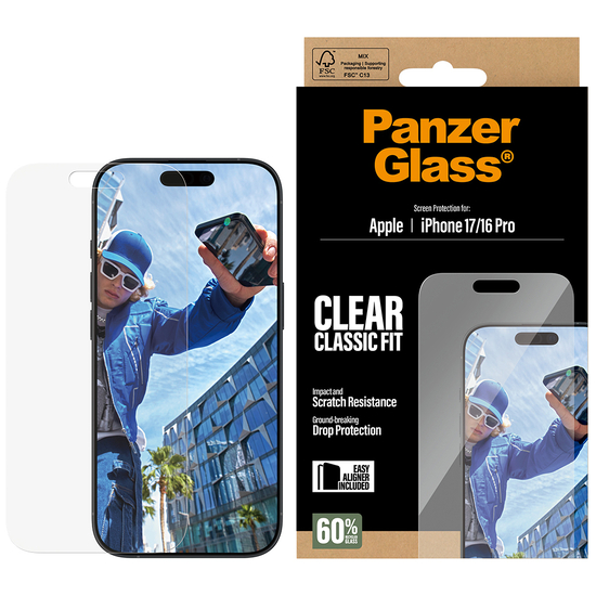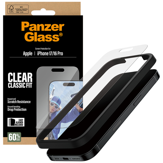 Ridser? Nej tak! Revner? Nej tak! Skærmbeskytter fra PanzerGlass lavet af 60 % genanvendt glas, der holder både ridser, revner, slag og stød på sikker afstand af din skærm? Ja tak! Skærmbeskytteren fungerer som en diskret airbag, der beskytter din skærm mod hverdagens små uheld – uden at det går ud over telefonens funktionalitet og lækre design. Og som om det ikke var nok, har skærmbeskytteren endda en smudsafvisende belægning, der reducerer fedtfingre og snavs. Den medfølgende EasyAligner lavet af 100 % genanvendt plast gør installationen så legende let, at de fleste kan klare den i første forsøg. Og ellers følger du bare trin-for-trin-guiden eller scanner QR-koden til sådan-installerer-du-videoen. Når først skærmbeskyttelsen sidder på telefonen, er det slut med at frygte synet af din skærm med kurs mod asfalten. Det kommer muligvis aldrig til at ske, men hvis det gør, vil du fortryde, at du ikke klikkede "Tilføj til kurv". Skærmbeskytteren kan forlænge levetiden på din telefon, så du en dag kan give den videre til en anden, som vil elske den lige så højt som dig. Det er ren telefonkærlighed – og én måde at bidrage til en mere bæredygtig fremtid på! En anden er at bruge mindre emballage: I 2024 reducerede vi mængden af papir i vores emballager med 66 %*, og vi leverer selvfølgelig dette produkt i en genanvendelig FSC -mærket æske. Skærmbeskytteren har størrelsen "Classic Fit", hvilket betyder, at den dækker den aktive del af din skærm. Og vil du passe ekstra godt på din telefon, kan du nemt kombinere skærmbeskyttelsen med et PanzerGlass cover, fx et designercover fra CARE by PanzerGlass , og en PanzerGlass PicturePerfect eller Hoops kameralinsebeskytter. *Gennemsnitlig reduktion fra 2022 til 2024 beregnet ved at sammenligne udvalgte PanzerGlass kerneprodukter.