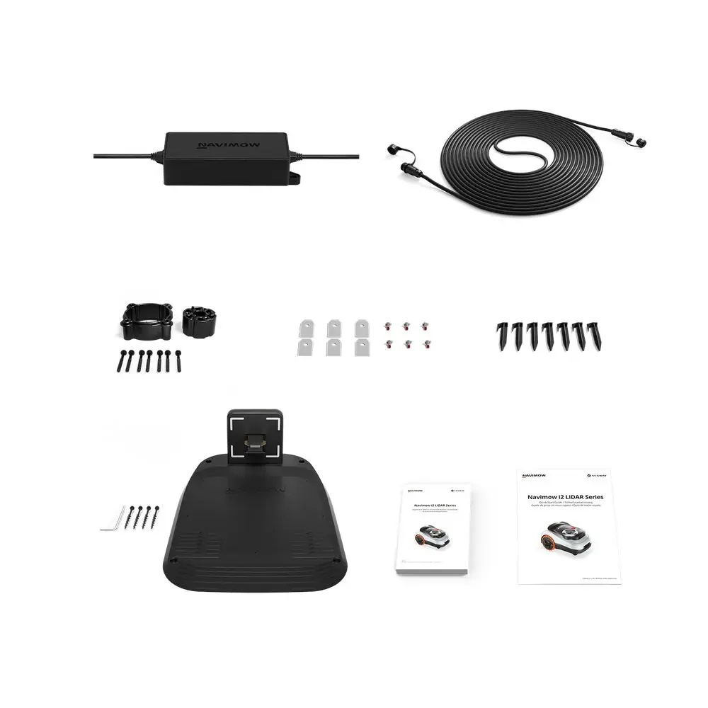 Included 1 x Navimow i210E Lidar Pro Robot Mower, 1 x Charging Station, 1 x Power Supply Unit, 10 x Pegs for securing the charging station, 1 x Set of Spare Blades and Bolts, 1 x User Manual and Quick Start Guide
