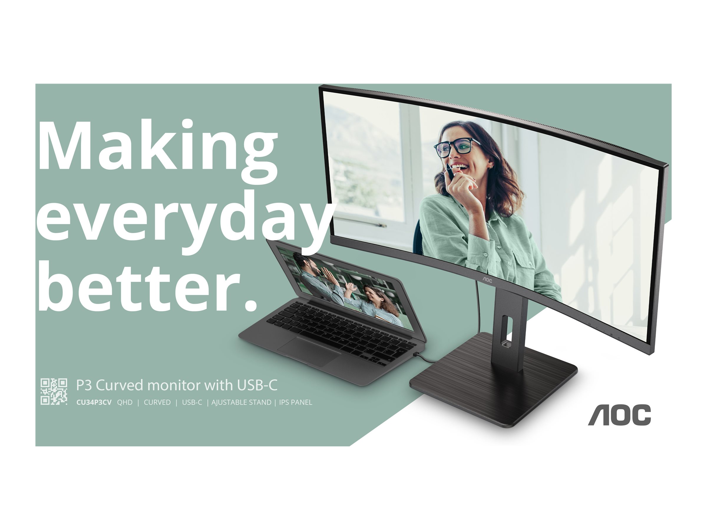 AOC CU34P3CV er en 34" WOHD (3440 × 1440) buet VA-skærm med et attraktivt ultratyndt design med tre sider, der giver en virkelig indlevende visning. Denne models brede QHD 21:9 billedformat udvider dit synsfelt og giver en omsluttende visning for en forbedret filmoplevelse. Panelet har en lysstyrke på 300 nits og generøse betragtningsvinkler på 178/178°, samt to indbyggede højttalere på 5W + 5W for at forbedre din daglige produktivitet i dagens fleksible kontormiljø. Skærmen CU34P3CV er klar til at øge din produktivitet med USB-C, der understøtter Power Delivery op til 65W, dataoverførsel og DP-alt tilstand. Forbindelsesmulighederne på denne skærm er udvidet med USB-hub og RJ-45. Med fokus på bæredygtighed er denne skærm udstyret med en række miljøcertificeringer, herunder EPA, TCO og EPEAT.