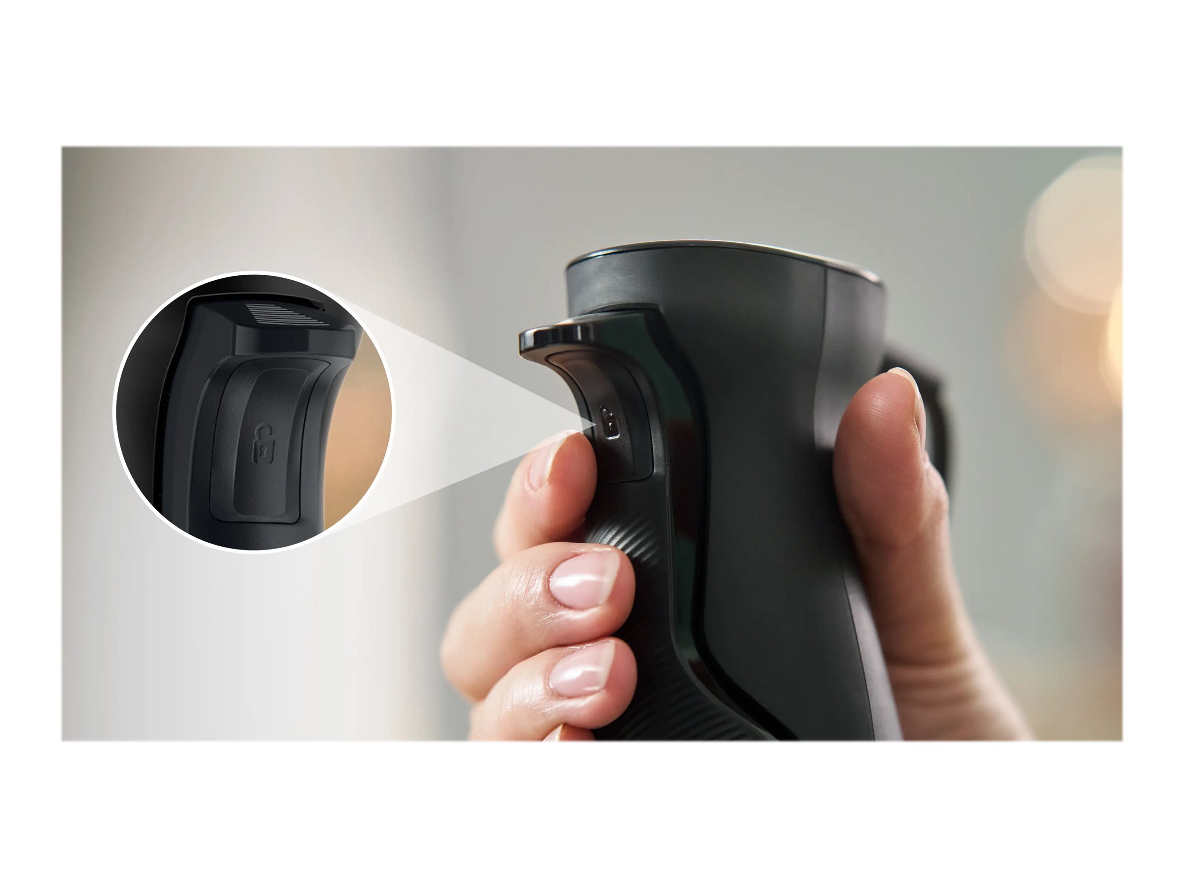 Det ergonomisk designede komfortgreb giver stabilitet og kontrol, hvilket forbedrer den samlede brugeroplevelse under blendeopgaver.