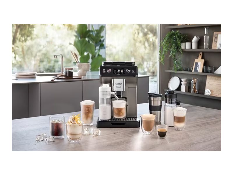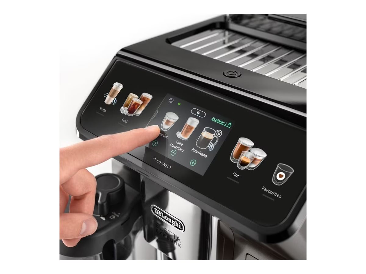 Mere end 50 varme, kolde og cold brew drikke med De'Longhi Eletta Explore automatisk kaffemaskine med titaniummalet front. Nyd automatisk varm mælkeskum takket være LatteCrema Hot Technology og forfriskende kolde og cold brew kaffedrikke med LatteCrema Cool og Cold Extraction Technologies. Nyd din egen café derhjemme og på farten med To-Go-funktionen.