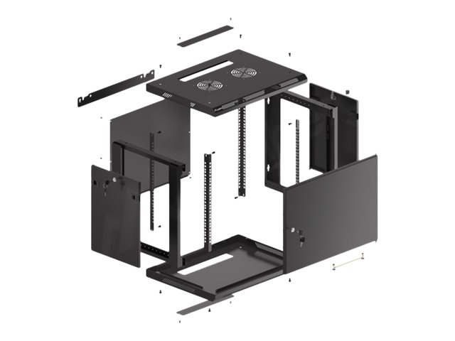 | Egenskaber | Låsbar frontdør, låsbart sidepanel, top- og bundkabelindgangspunkter, flad pakke, 180 graders døråbning, aftagelige sidepaneler, IP20 beskyttelse, 2 åbninger til blæser, metalfordør |
