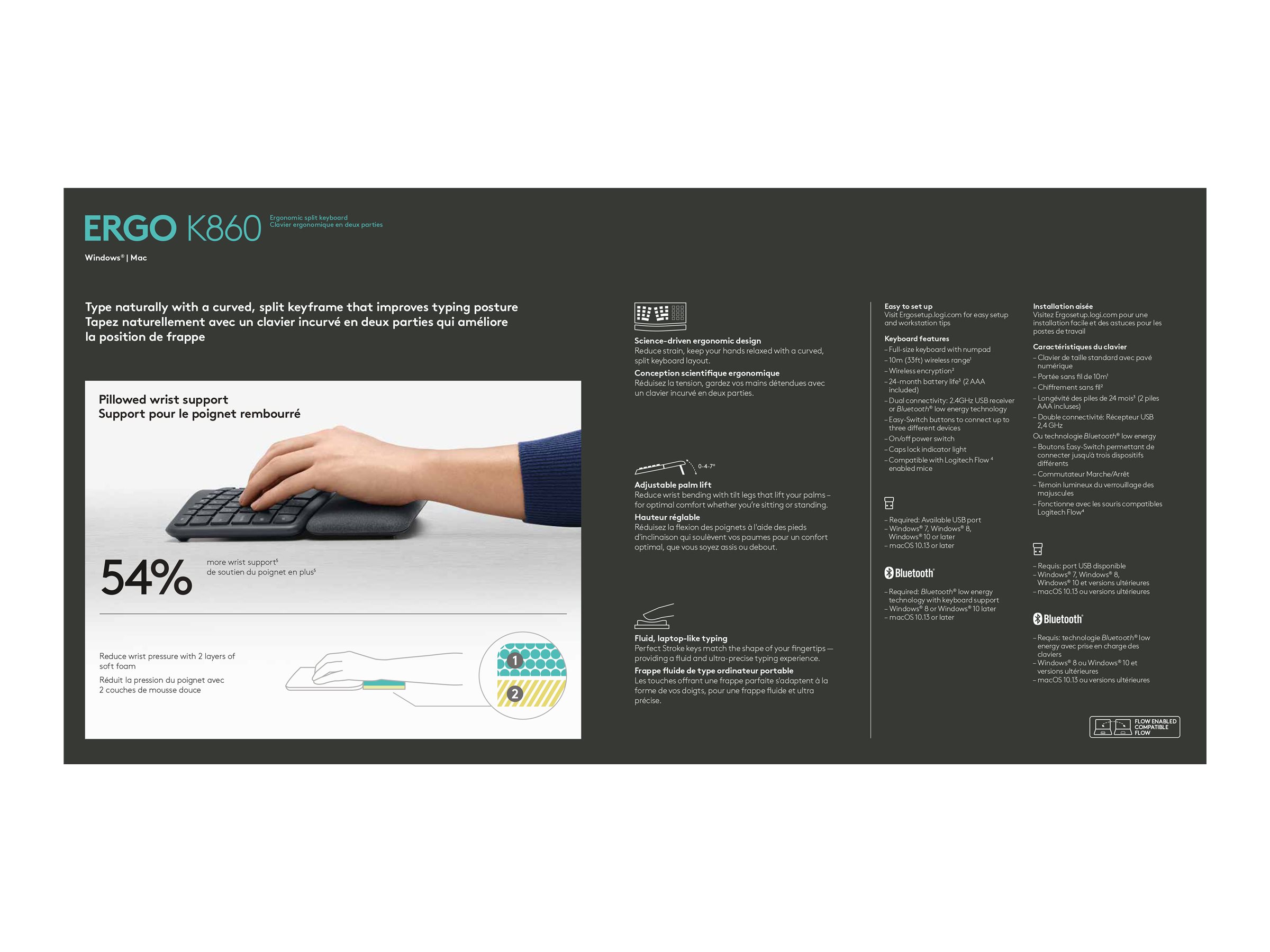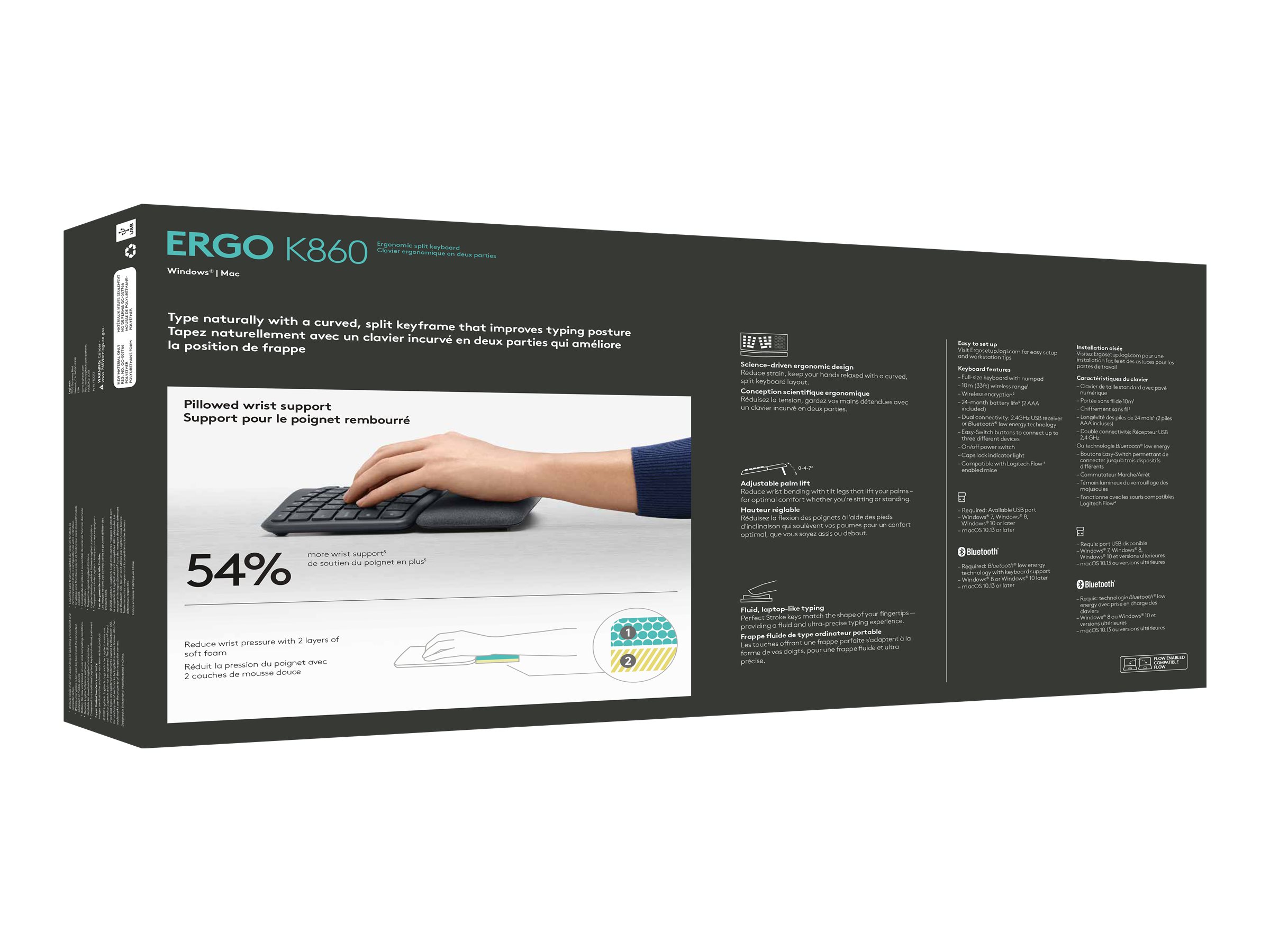 Med det buede tastatur på ERGO K860 kan du placere dine hænder, håndled, fingre og underarme i en mere naturlig position du vil lægge mærke til aflastningen i det øjeblik dine hænder lander på tastaturet. ERGO K860 har endda vist sig at reducere muskelaktivitet med 21 % i den øvre trapezmuskel – en vigtig muskulatur i midten af ryggen, der stabiliserer og understøtter bevægelse af skulder og nakke