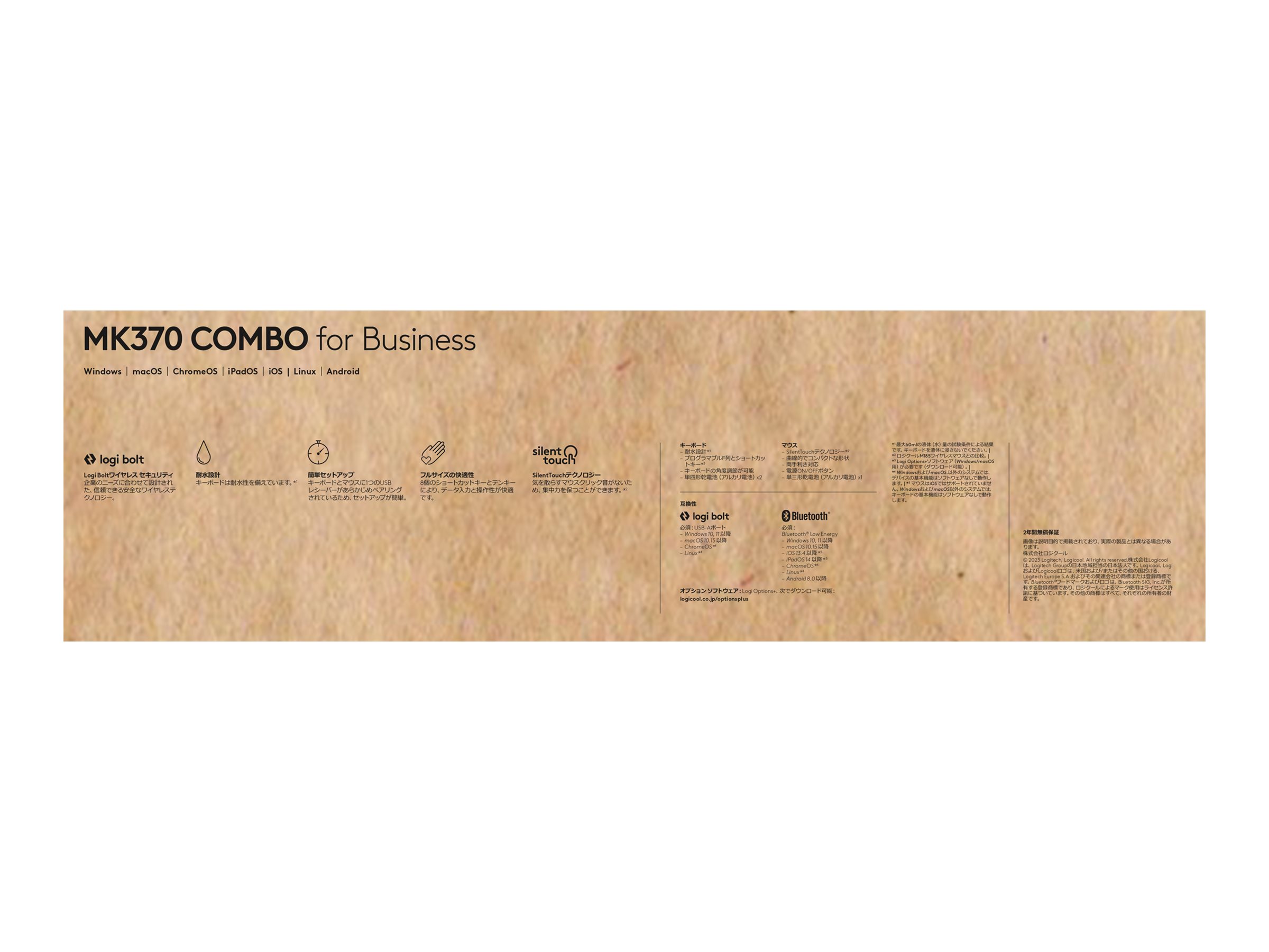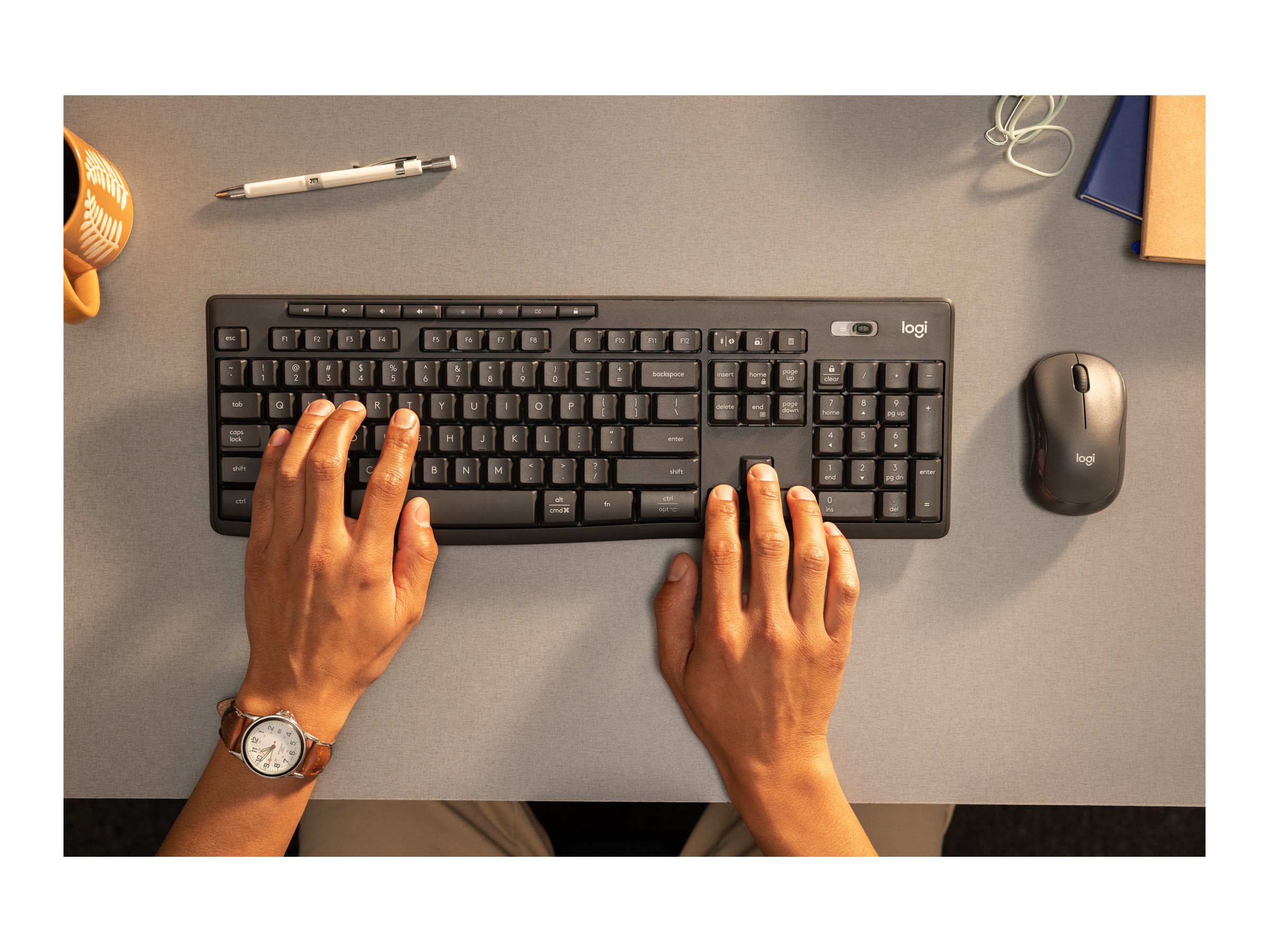 Kombisættet har et væskeafvisende(1) tastatur i fuld størrelse, lydløs mus, otte forprogrammerede genvejstaster og Logi Bolt for sikker og robust trådløs forbindelse