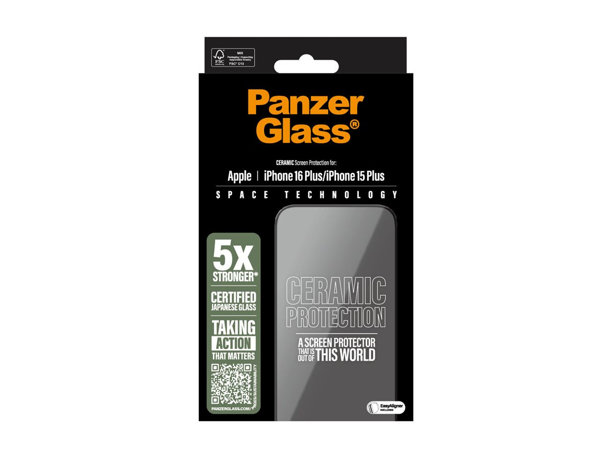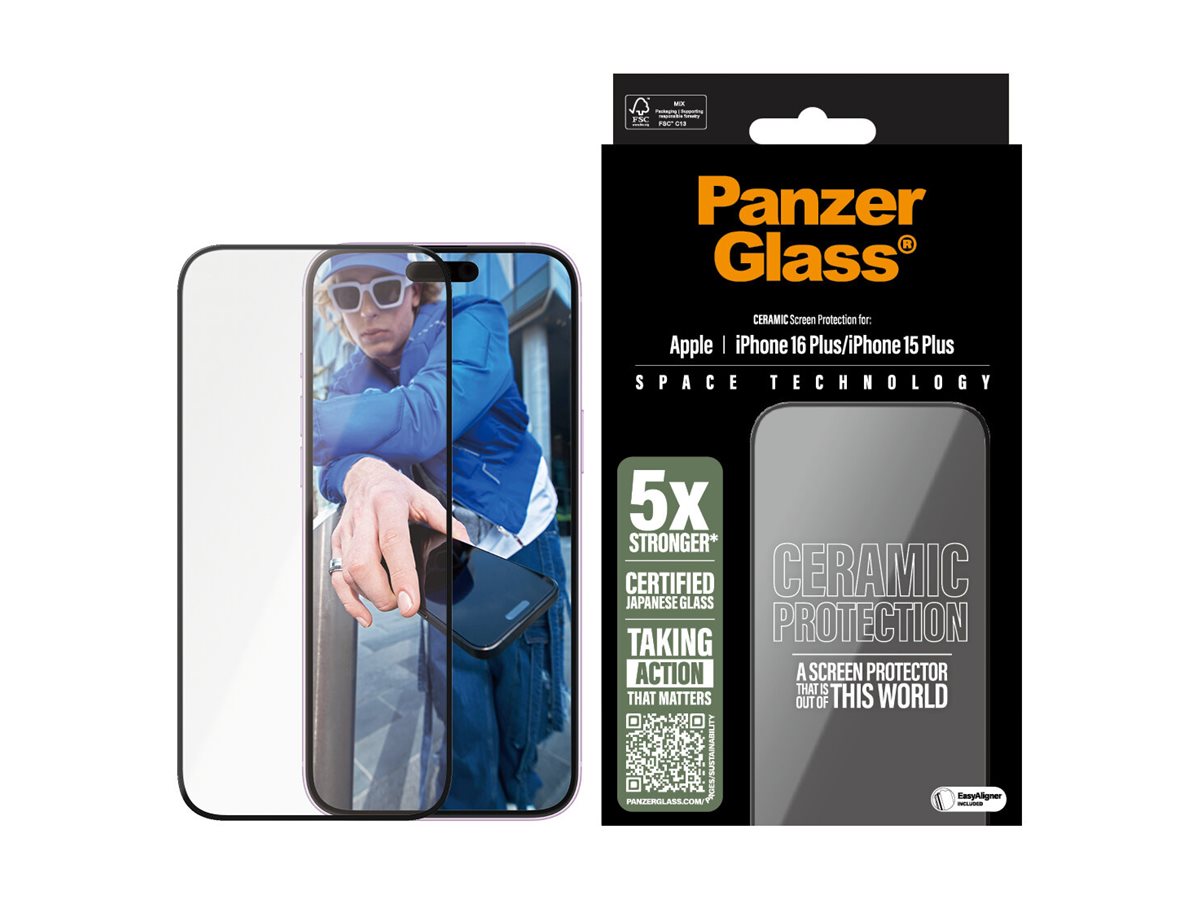 Med Ceramic Protection rækker PanzerGlass ud efter stjernerne og giver dig sin stærkeste skærmbeskytter til dato … ja, faktisk er Ceramic Protection hele 5 gange stærkere end vores stærkeste skærmbeskytter til dato! Det svarer til, at du kan lade en 320 g tung stålkugle falde fra 2,5 meter og ned på skærmbeskytteren, uden at den får så meget som en revne. Det er et tungtvejende argument, hvis du spørger os.  Skærmbeskytteren er lavet af certificeret keramisk glas fra japanske Ohara. Keramisk glas er ikke blot et af verdens mest ridsefaste materialer, men indeholder også ikke-synlige krystaller, der forhindrer revner i at sprede sig. Det giver keramisk glas en styrke, som ikke kan opnås med konventionelt skærmbeskytterglas. Og som om det ikke var nok, sikrer Oharas nano-krystalliseringsteknik en hidtil uset klarhed i glasset, som endda er udstyret med en smudsafvisende belægning, der reducerer fedtfingre og snavs.  Den medfølgende EasyAligner gør installationen så legende let, at de fleste kan klare den i første forsøg. Og ellers er det bare at følge trin-for-trin-guiden eller scanne QR-koden til sådan-installerer-du-videoen. Når først skærmbeskyttelsen sidder på telefonen, er det slut med at frygte synet af din skærm med kurs mod asfalten. Det kommer muligvis aldrig til at ske, men hvis det gør, vil du fortryde, at du ikke klikkede "Tilføj til kurv".  Skærmbeskytteren har størrelsen "Ultra-Wide Fit". Det betyder, at den dækker fronten af din telefon, samtidig med at den giver dig en fuldendt skærmoplevelse og efterlader lidt plads langs kanterne til et beskyttende cover fra PanzerGlass . Og vil du passe ekstra godt på din telefon, kan du nemt kombinere skærmbeskytteren og coveret med en PanzerGlass PicturePerfect eller Hoops kameralinsebeskytter.  P.S. Ceramic Protection bliver selvfølgelig leveret i en FSC -mærket æske, der kan genanvendes.