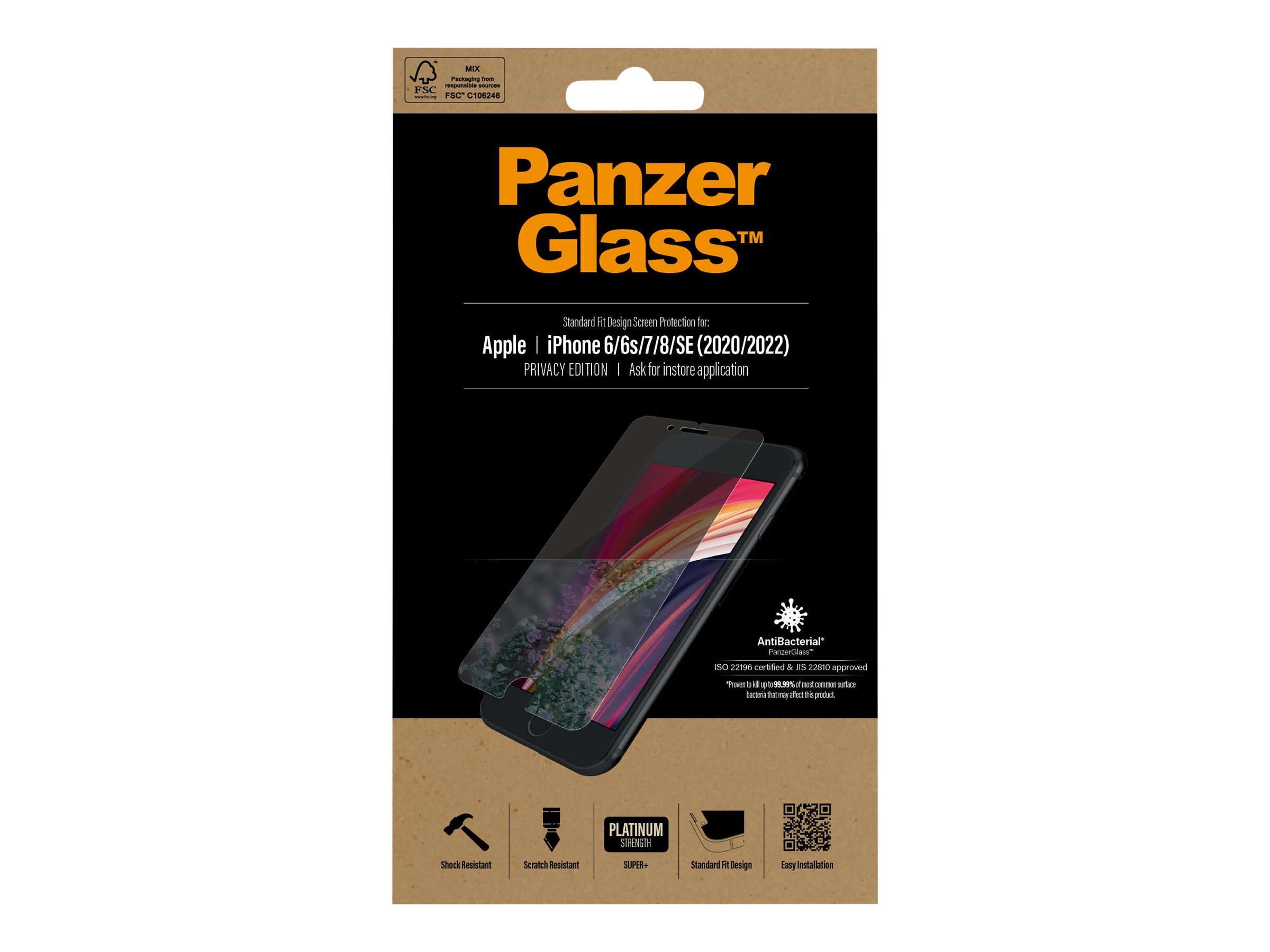 Private beskeder. Bankoplysninger. Pinkoder. Med denne skærmbeskyttelse kan du skjule dine hemmeligheder mod nysgerrige øjne hos folk, der sidder ved siden af dig i toget, i bussen eller på kontoret. Det specialdesignede privatlivsfilter gør indholdet på skærmen praktisk talt usynligt for alle andre end dig.Utilsigtede bump mod skarpe genstande i lommen eller drop på stenhårdt underlag er heller ikke noget problem for denne skærmbeskyttelse, der er modstandsdygtig over for ridser og stød. Den har endda en fingeraftryksafvisende overfladebehandling med antibakteriel effekt, der reducerer spor af fedtfingre og dræber op til 99,99 % af alle almindelige overfladebakterier. Skærmbeskyttelsen Standard Fit dækker den aktive del af din skærm. Skærmbeskytteren leveres i en FSC -mærket emballage, som kan genanvendes.