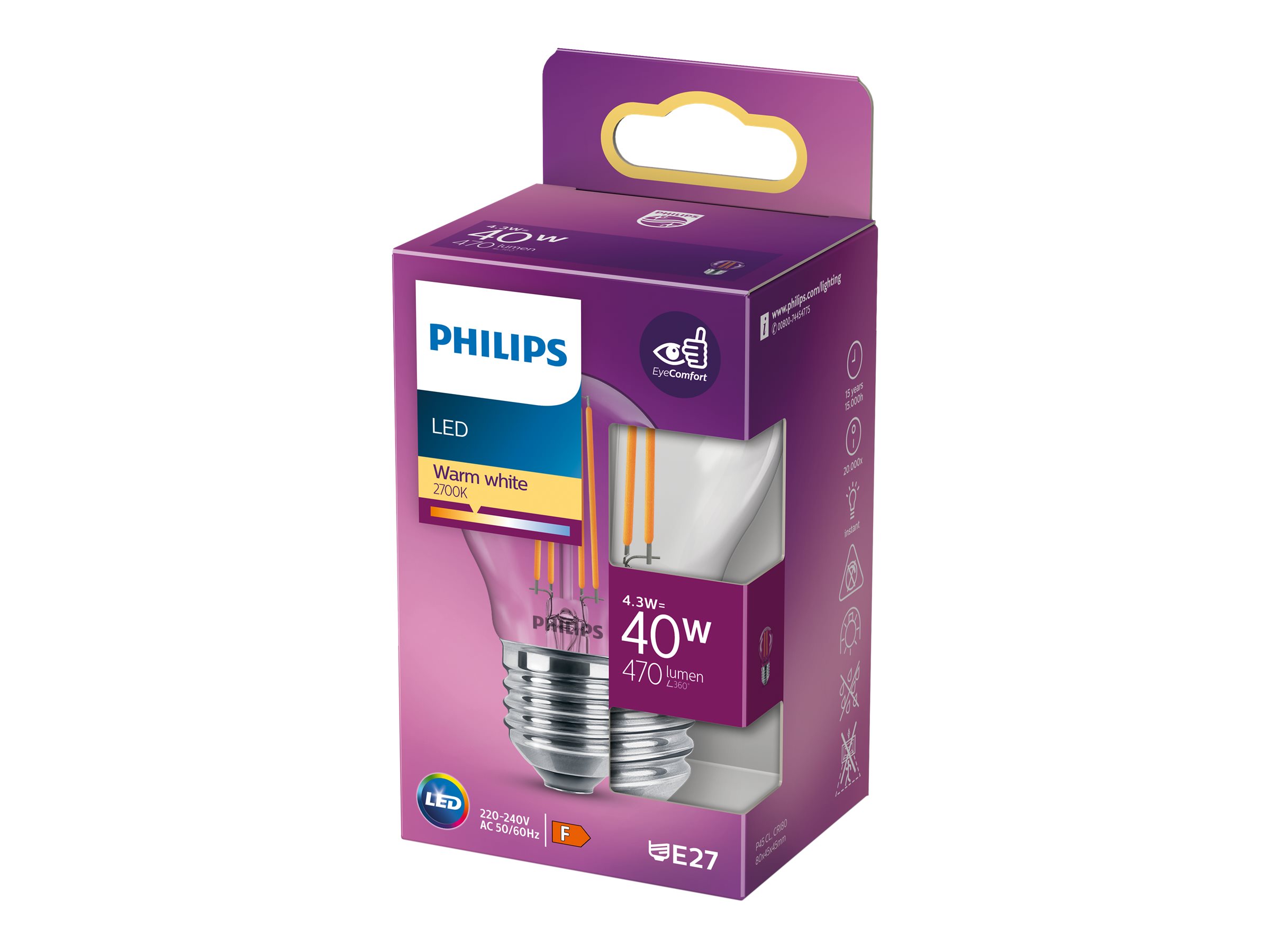 | Produktbeskrivelse | Philips - LED-filament-lyspære - form: P45 - klar finish - E27 - 4.3 W - varmt hvidt lys - 2700 K |