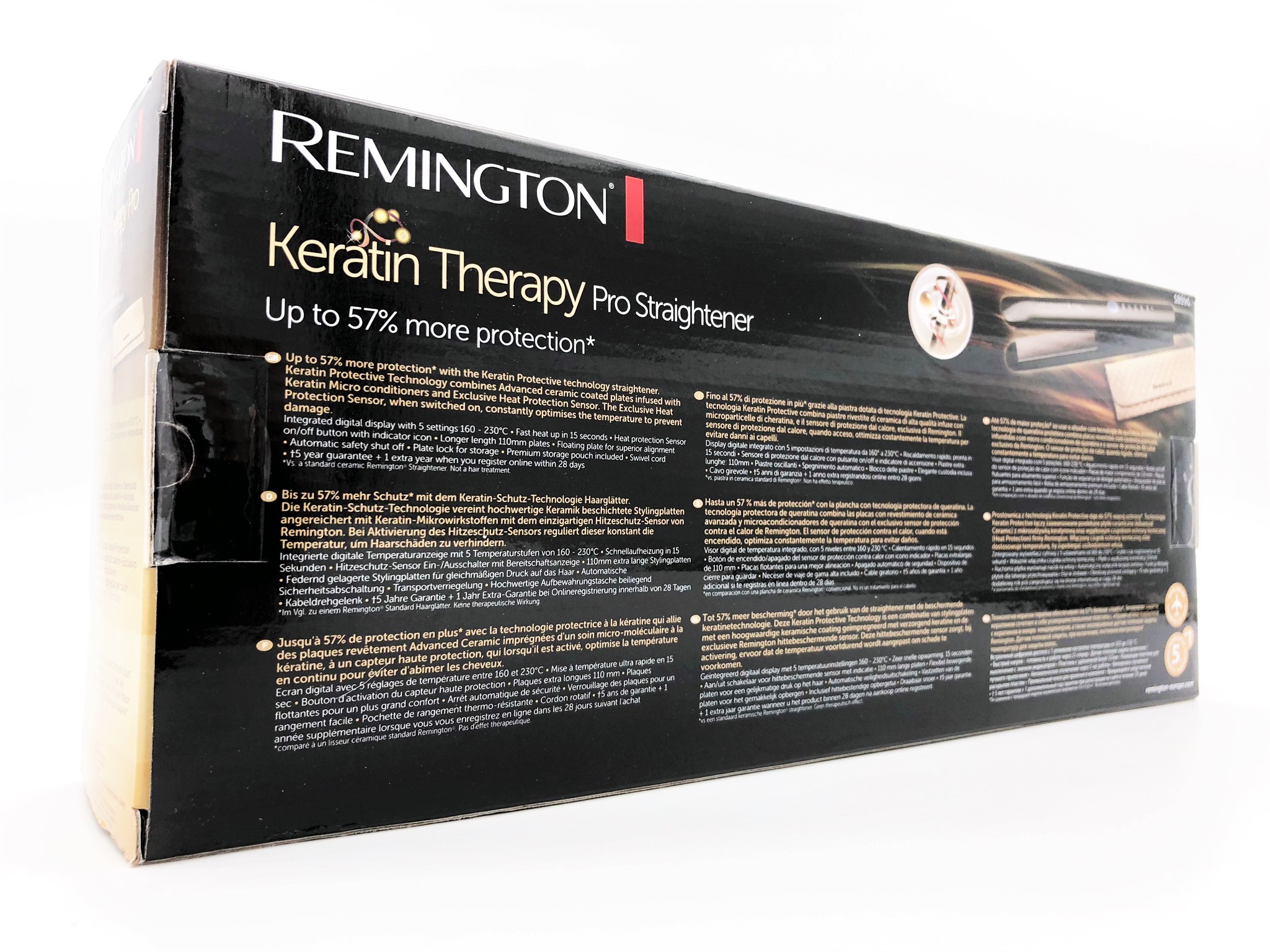 | Hårtorks- och stylingfunktioner | Rörlig platta, 15 sekunders uppvärmning, extra långa plattor, turboläge, variabel temperatur, tangentlås, plattlock, Avancerad keratinkeramisk beläggning, värmeskyddssensor, Keratin Protective-teknik |
