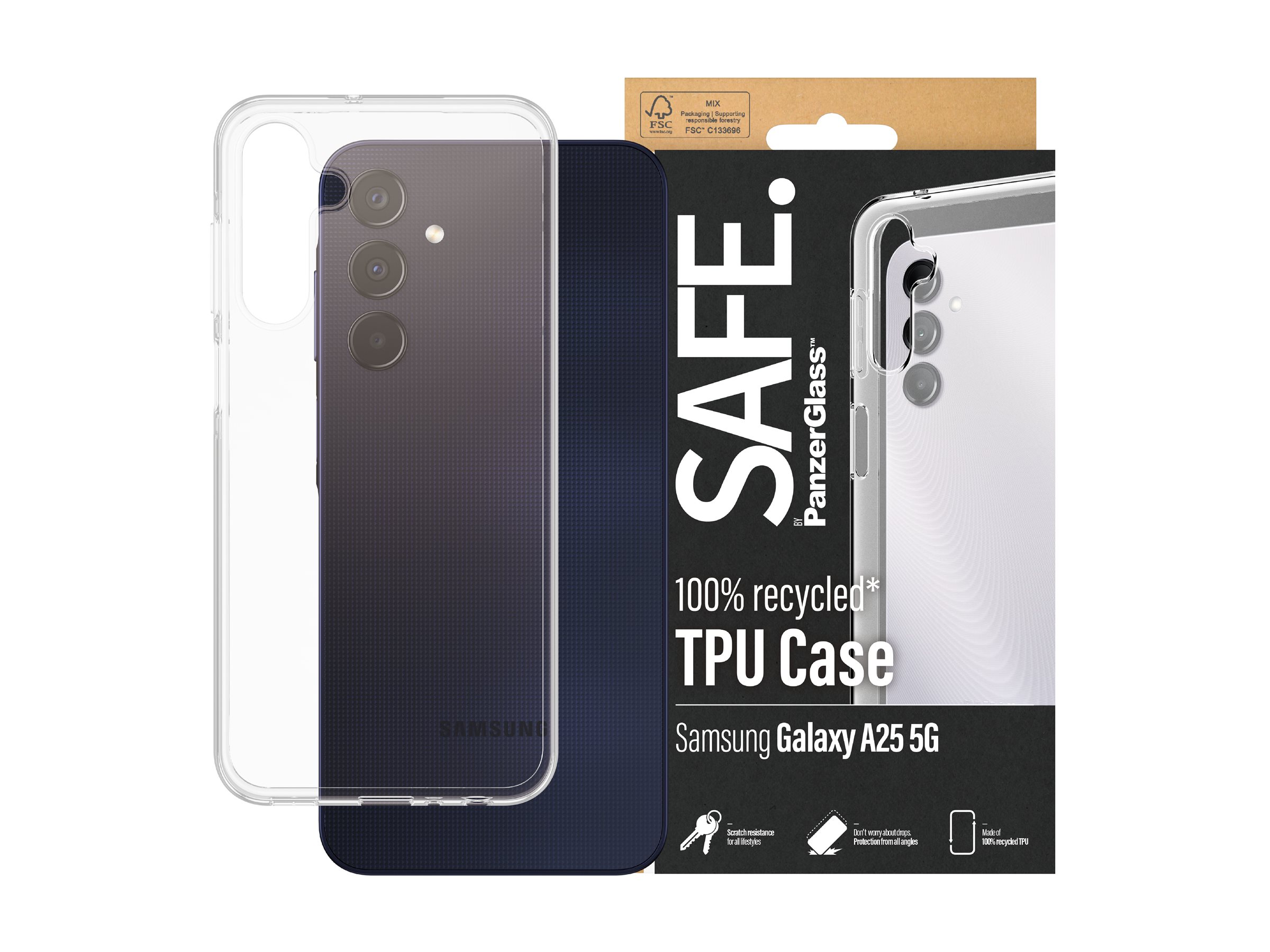 Beskyt din telefon mod selfiefumlerier, postingkatastrofer og jeg-kan-da-sagtens-tekste-mens-jeg-danser-uheld med en Soft TPU Case fra SAFE. by PanzerGlass ️. Den lækre, slanke case er lavet 100 % genanvendt plast, er kompatibel med trådløs opladning og passer godt på din telefon, samtidig med at den giver dig fuld adgang til alle telefonens funktioner. Du behøver ikke engang være bekymret for misfarvninger: Casen har en blød, gennemsigtig bagside og ramme, som bliver ved med at se pæn ud, selv efter lang tids brug, masser af sollys og et hav af strandfester.Soft TPU Casen kan forlænge levetiden på din telefon, så du måske en dag kan give den videre til en anden, som vil elske den lige så højt som dig. Det er ren telefonkærlighed. For jo længere vi kan holde vores enheder i live, jo længere kan vi vente med at producere nye enheder, som belaster miljøet. Og nu vi taler om miljøet, bruger den her Soft TPU Case 45%* mindre papiremballage end tidligere modeller og leveres i en genanvendelig FSC ️-mærket æske.Installationen er legende let. Bare klik casen på, og så er det slut med at frygte synet af din telefon med kurs mod asfalten. Det kommer muligvis aldrig til at ske, men hvis det gør, vil du fortryde, at du ikke klikkede "Tilføj til kurv". Og husk: Hvis du vil passe ekstragodt på din telefon, kan du kombinere casen med en skærmbeskytter og en kameralinsebeskytter for at give din telefon 360-graders beskyttelse.*Målt ved at sammenligne massen af 2023 papemballage med massen af 2022 papemballage. Målinger udført af tredjeparts laboratorium (CPRTC, rapport nr. ZSA20231301-0016).
