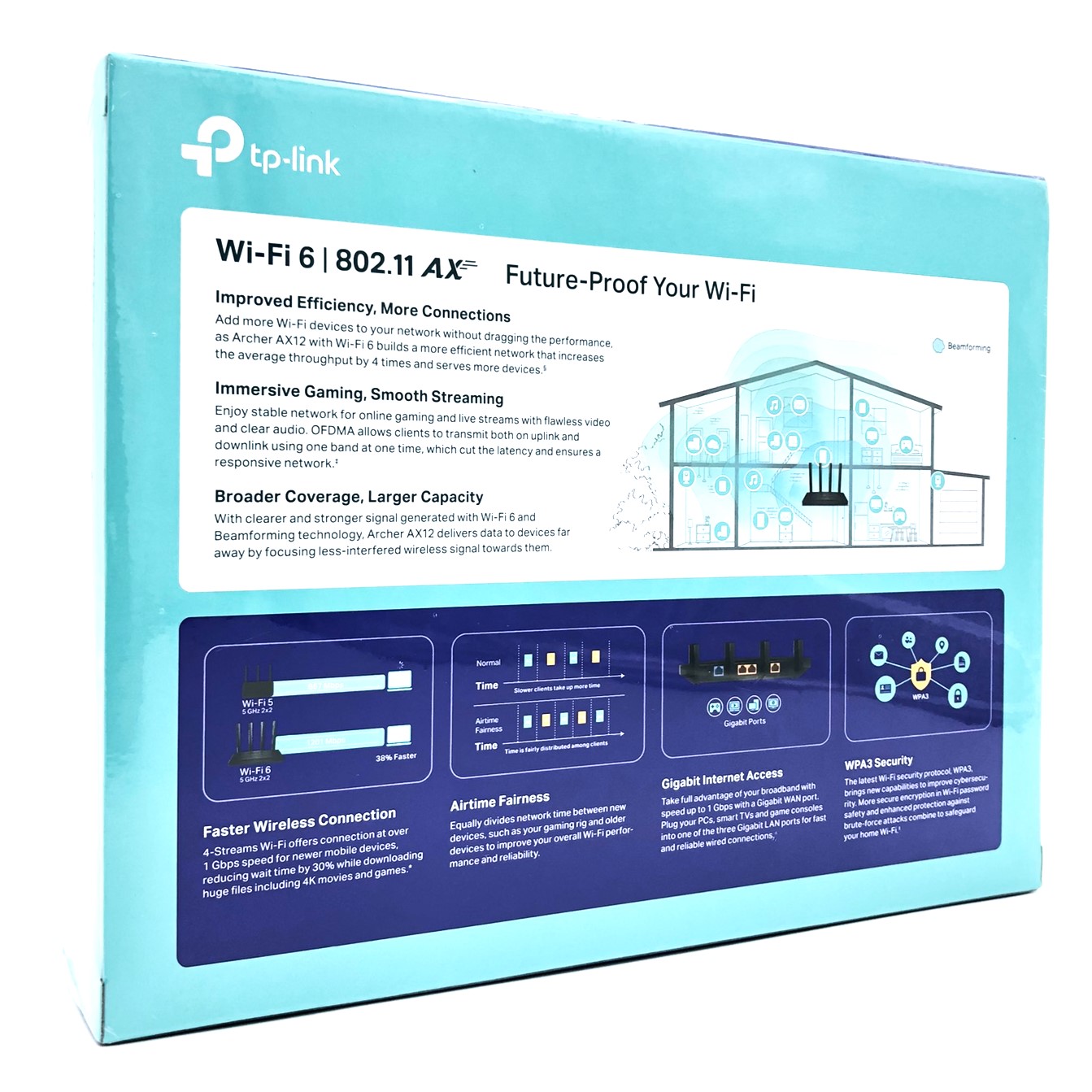 | Egenskaber | IGMP snooping, URL-filtrering, forældrekontrol, Tilgangspunkt, drift, WMM support, ACL support, QoS, WPS, DHCP server, port fremsendelse, port triggering, SPIF, IP-MAC binding, DHCP klient, FOTA, IGMP proxy, MU-MIMO teknologi, stråleformeteknologi, routertilstand, Airtime Fairness, VLAN Tagging, PPTP server, OpenVPN server, IPTV support, Guest Network, Address Reservation, TWT, dynamisk DNS, trådløs radio aktivering/deaktivering |