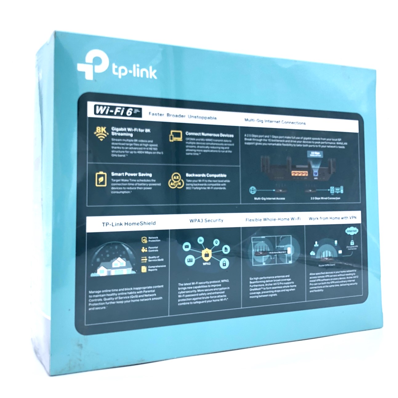 | Egenskaber | IGMP snooping, SPI, DFS-understøttet, forældrekontrol, Tilgangspunkt, drift, ACL support, QoS, virtuel server support, WPS, DHCP server, Samba support, FTP server, port fremsendelse, UPnP Media Server, nulstillingsknap, Apple Time Machine kompatibel, port triggering, dynamisk IP modus, IP-MAC binding, DHCP klient, 4T4R MIMO-teknologi, mærket VLAN, IGMP proxy, stråleformeteknologi, Static Link Aggregation, LED til/fra-knap, Airtime Fairness, 4x4 MU-MIMO-teknologi, Smart Roaming, DMZ-support, brotilstand, OpenVPN-klient, IPTV support, 8K HD video streaming, WPS-knap, OneMesh support, 160 MHz båndbreddesupport, auto-firmware-opdatering, TP-Link HomeShield, Wi-Fi til/fra-knap |